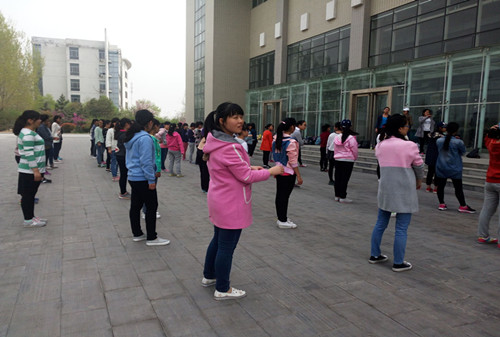 两名体育学院优秀教练应邀指导训练。训练从三月二十五日开始,周一到周五每天中午和晚上在操场上各训练一个小时,训练人数由最初近百人经过多次淘汰,固定为二十余名。选拔后留下来的同学更是信心满满,懂得加倍训练。在第一周,主要进行了基本步伐和手型的规范训练,培养训练者的协调性和节奏感,也可以使训练者的身体具有挺拔感和轻盈感。在第二周,开始训练各种步伐及手型的组合。训练很辛苦,教练根据队员们的情况调整训练力度,不断鼓励队员们端正心态,集中精神,反复练习,客服麻痹松懈的心理,将振奋的精神和昂扬的气势贯穿在训练中;队友则相互鼓励,互相纠正动作,团队氛围和谐融洽。