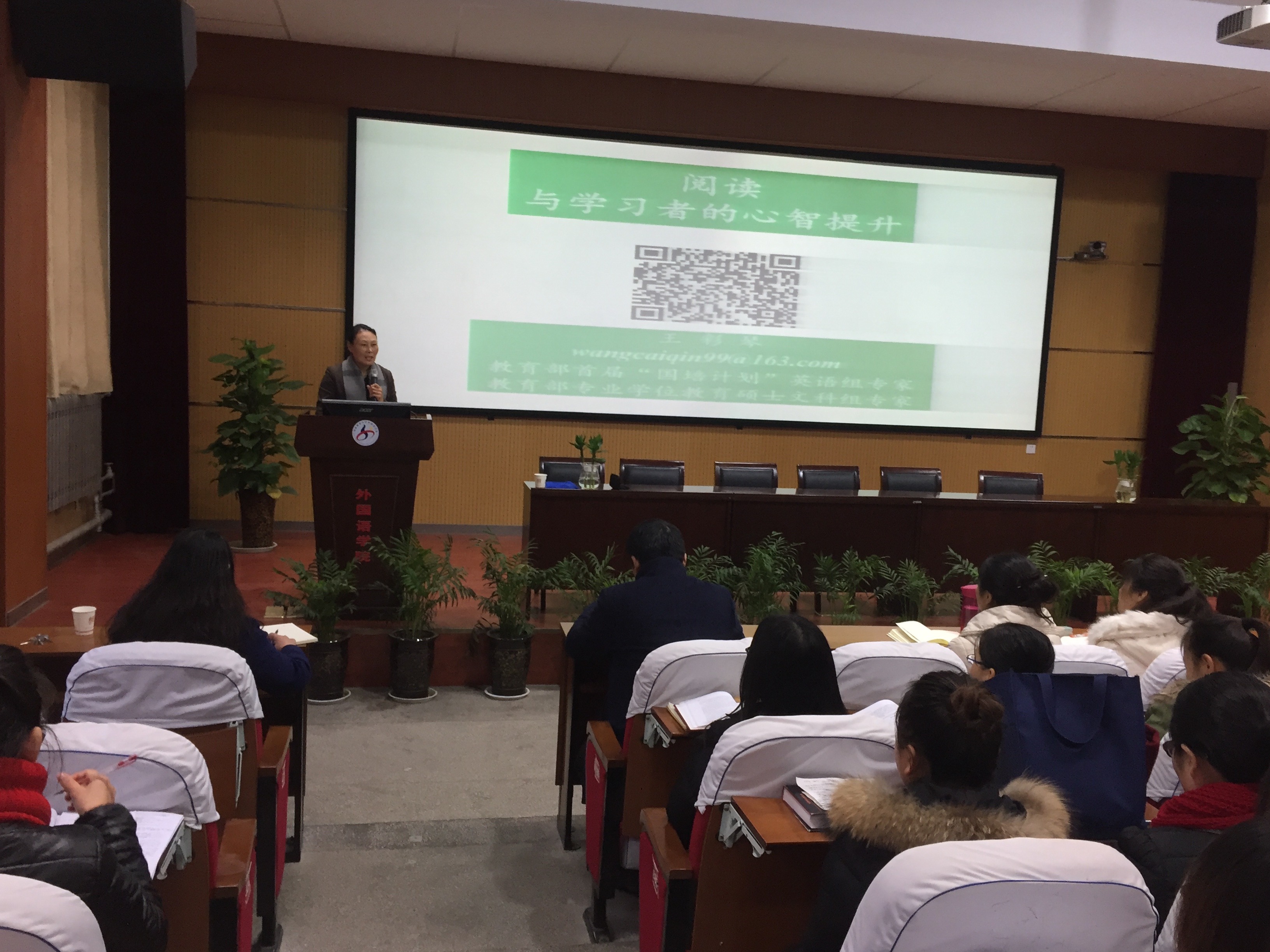 王彩琴教授的讲座从介绍其创建的芹菜园读书社展开,邀请了十几名读书社的成员上台依次作简短的报告。紧接着,王彩琴教授通过讲解义务教育《英语课程标准》(2011年版)中的课程目标结构,讲解了如何从心理学的角度进行语法教学。王彩琴教授语言轻松,将晦涩难懂的概念转变为浅显易懂的故事,给在场师生留下了深刻的印象。