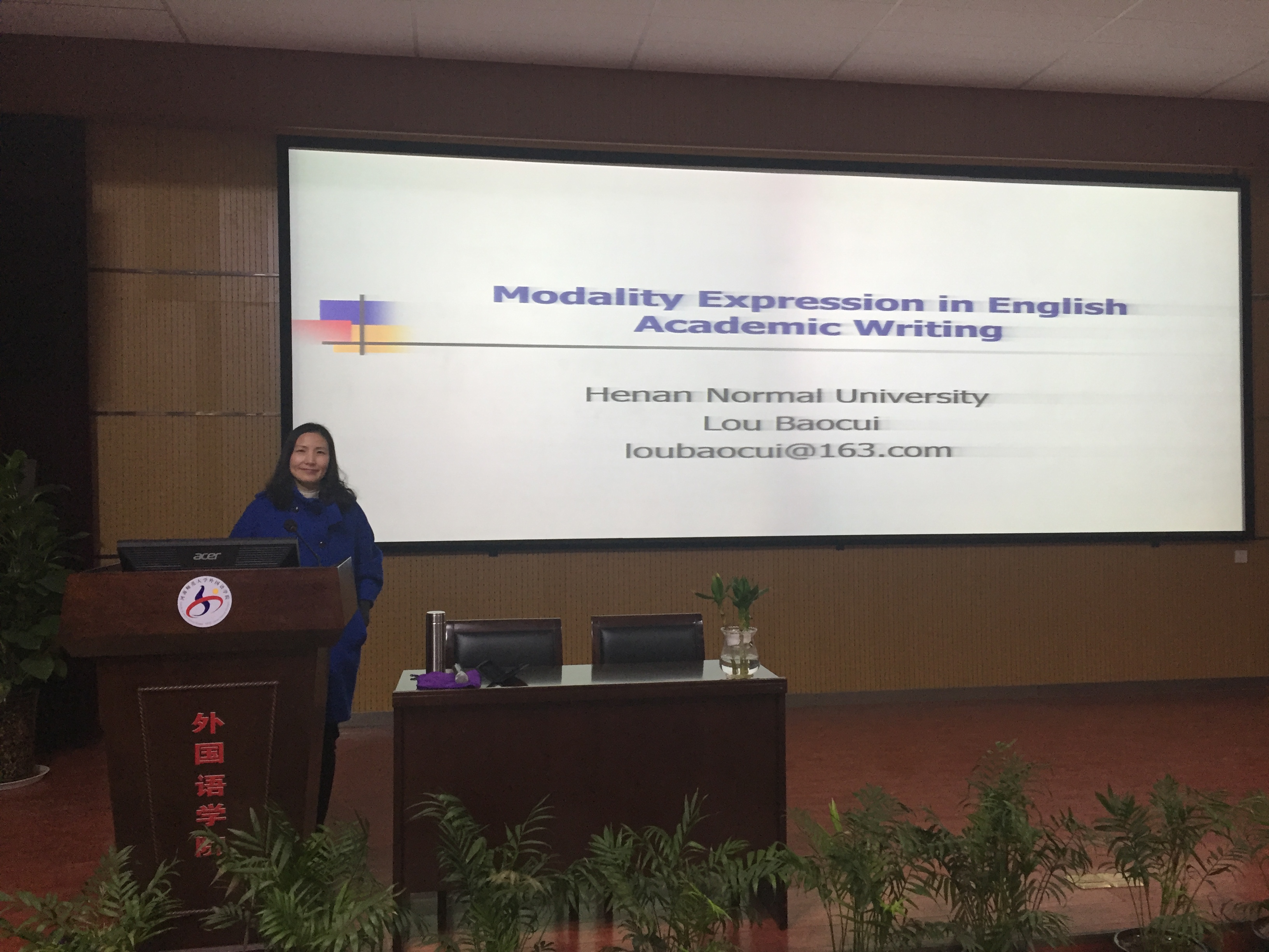 12月1日下午,娄宝翠教授在外国语学院学术报告厅作了题为“学习者学术英语写作情态表达特征研究”的讲座。外国语学院相关专业教师、研究生、本科生共百余人聆听了讲座。讲座由外国语学院肖俊林老师主持。