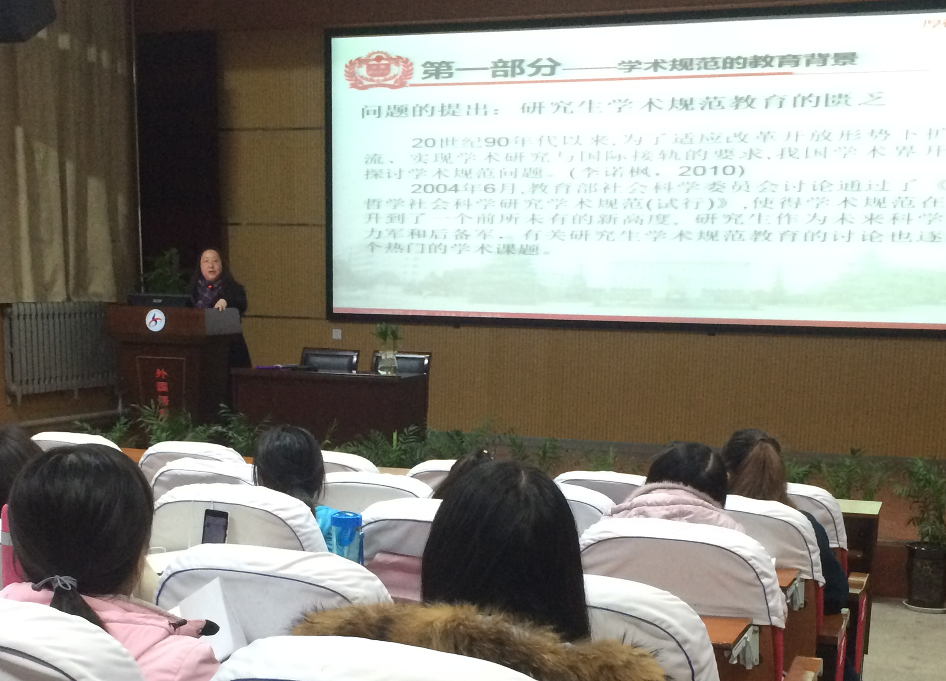 12月1日晚上,外国院学院院长梁晓冬教授在外国语学院学术报告厅作了题为“研究生学术规范养成教育”的讲座。外国语学院相关专业教师、研究生、本科生共百余人聆听了讲座。讲座由外国语学院肖俊林老师主持。
