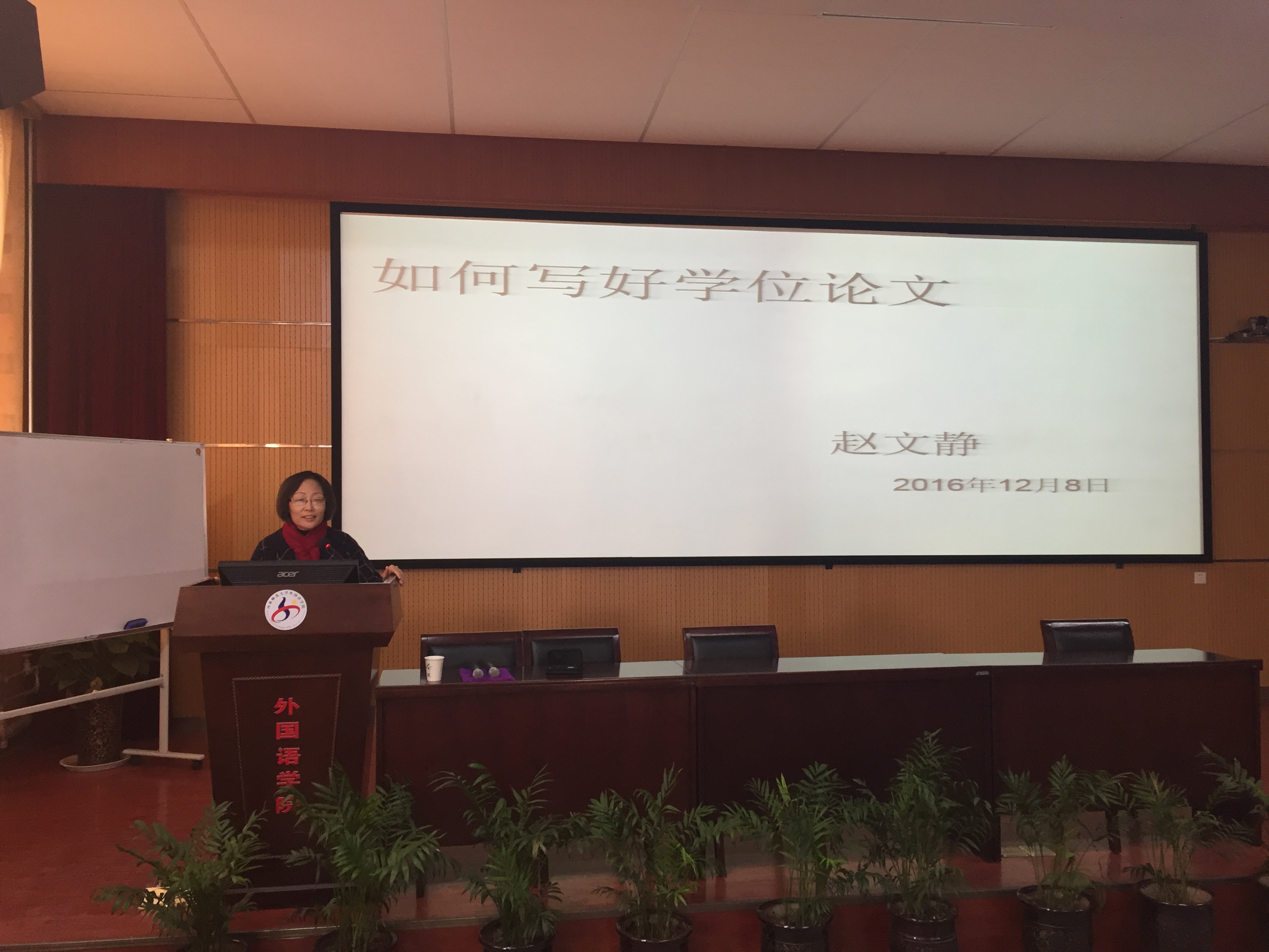 12月8日上午,赵文静教授在外国语学院学术报告厅作了题为“如何写好学位论文”的讲座。外国语学院相关专业教师、研究生、本科生共百余人聆听了讲座。讲座由外国语学院院长梁晓冬教授致辞,肖俊林老师主持。