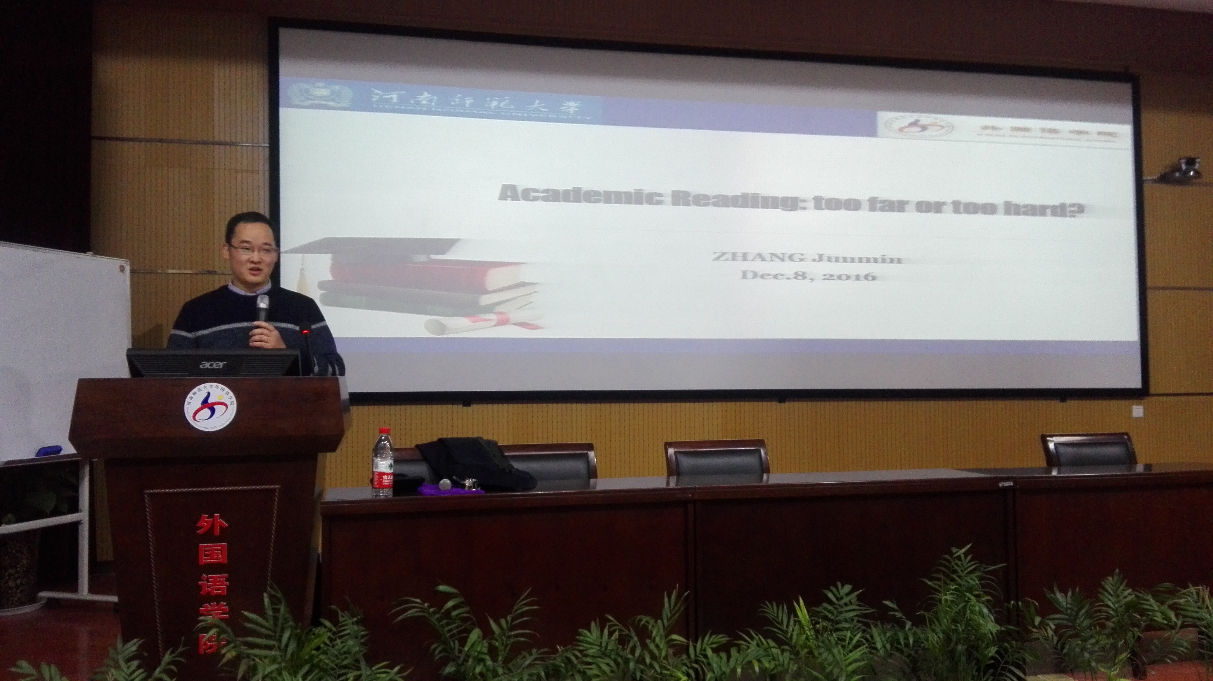 12月8日晚上,张军民副教授在外国语学院学术报告厅作了题为“Academic Reading: too far or too hard?”的讲座。外国语学院相关专业教师、研究生、本科生共百余人聆听了讲座。讲座由外国语学院赵文静教授主持。