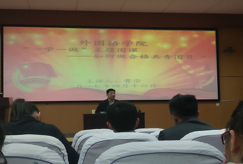 为深入贯彻学习习近平总书记系列重要讲话精神,提高广大共青团员的政治素养,近日,外国语学院于外院报告厅开展“一学一做”教育主题团日活动。外国语学院党委副书记曹崇担任本次团日活动主讲人,2014、2015和2016级全体学生干部参加本次活动。
