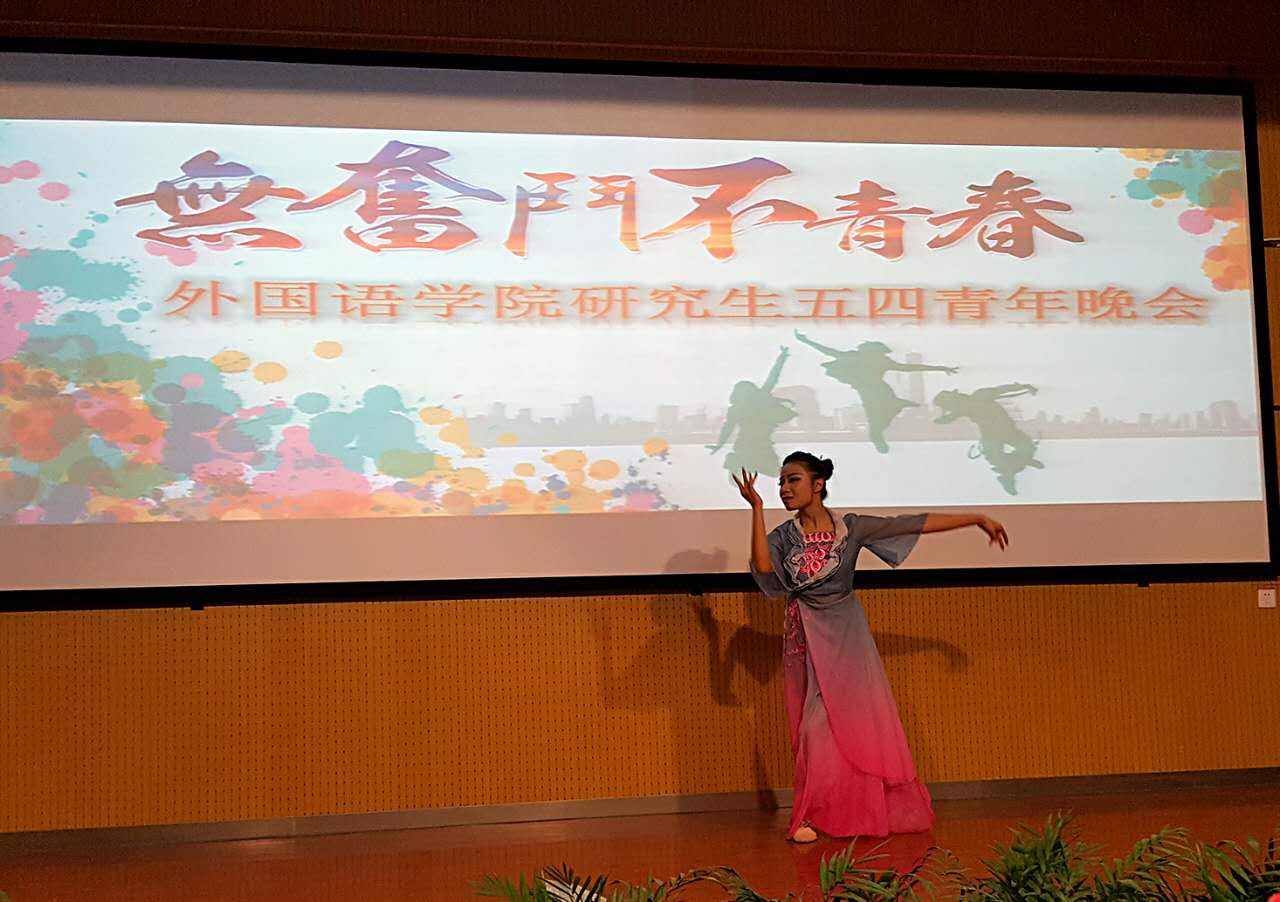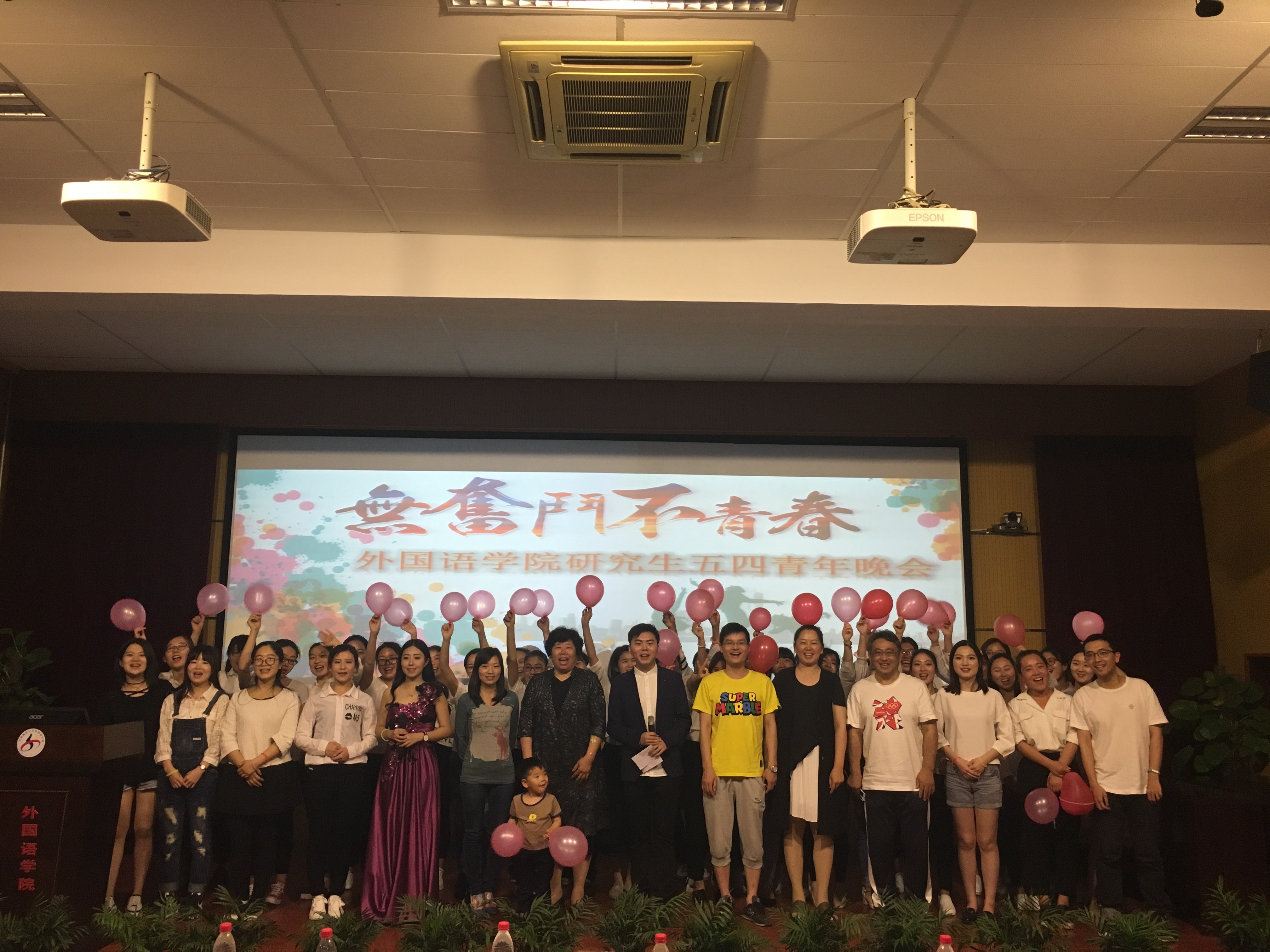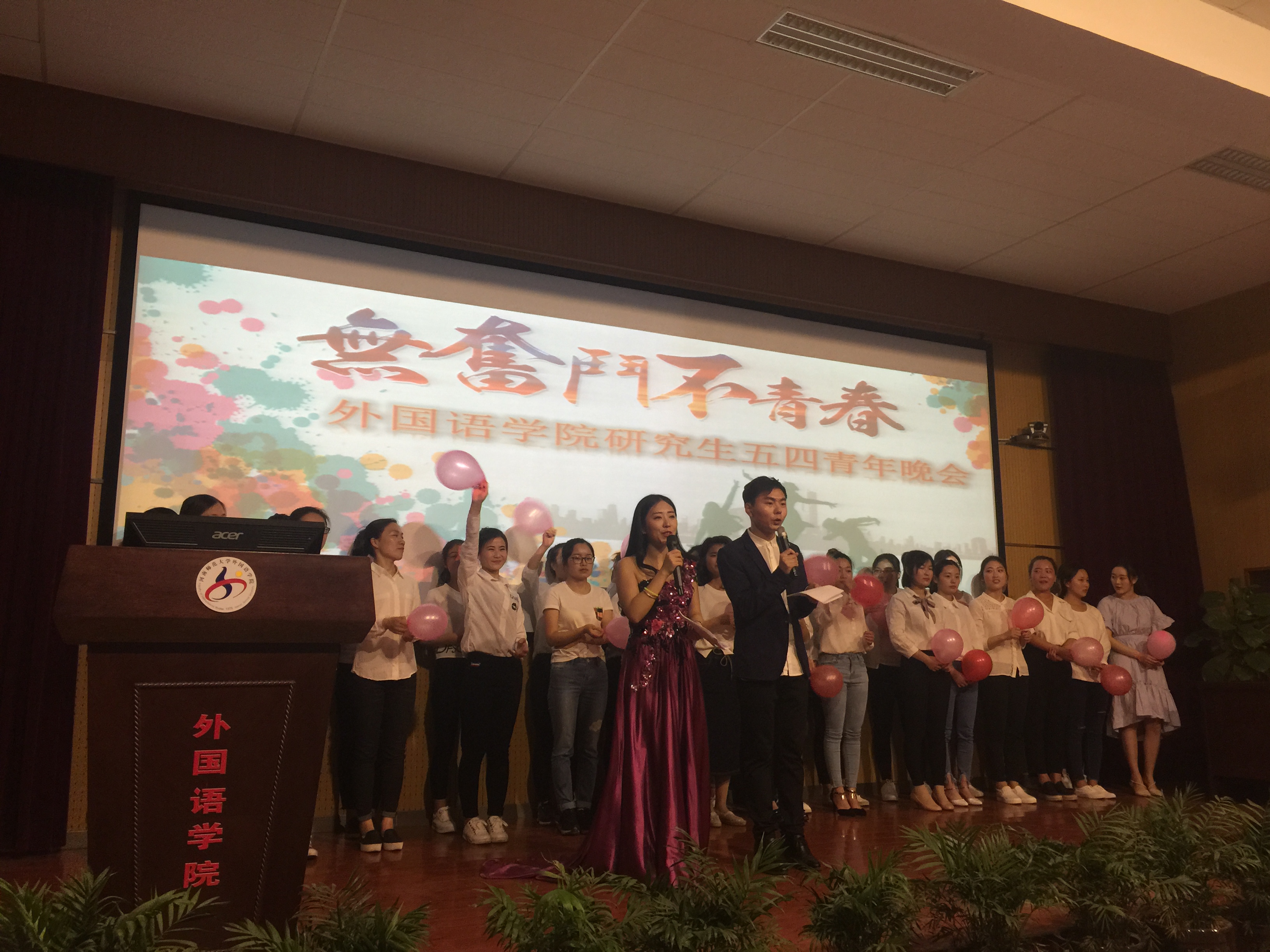 2017年5月5日晚,外国语学院研究生“无奋斗·不青春”五四青年晚会在外国语学院学术报告厅举行。院党委书记宋霞、副院长刘国兵、辅导员刘静观、教学秘书肖俊林、研究生导师们以及百余名研究生同学一起观看了本场晚会。