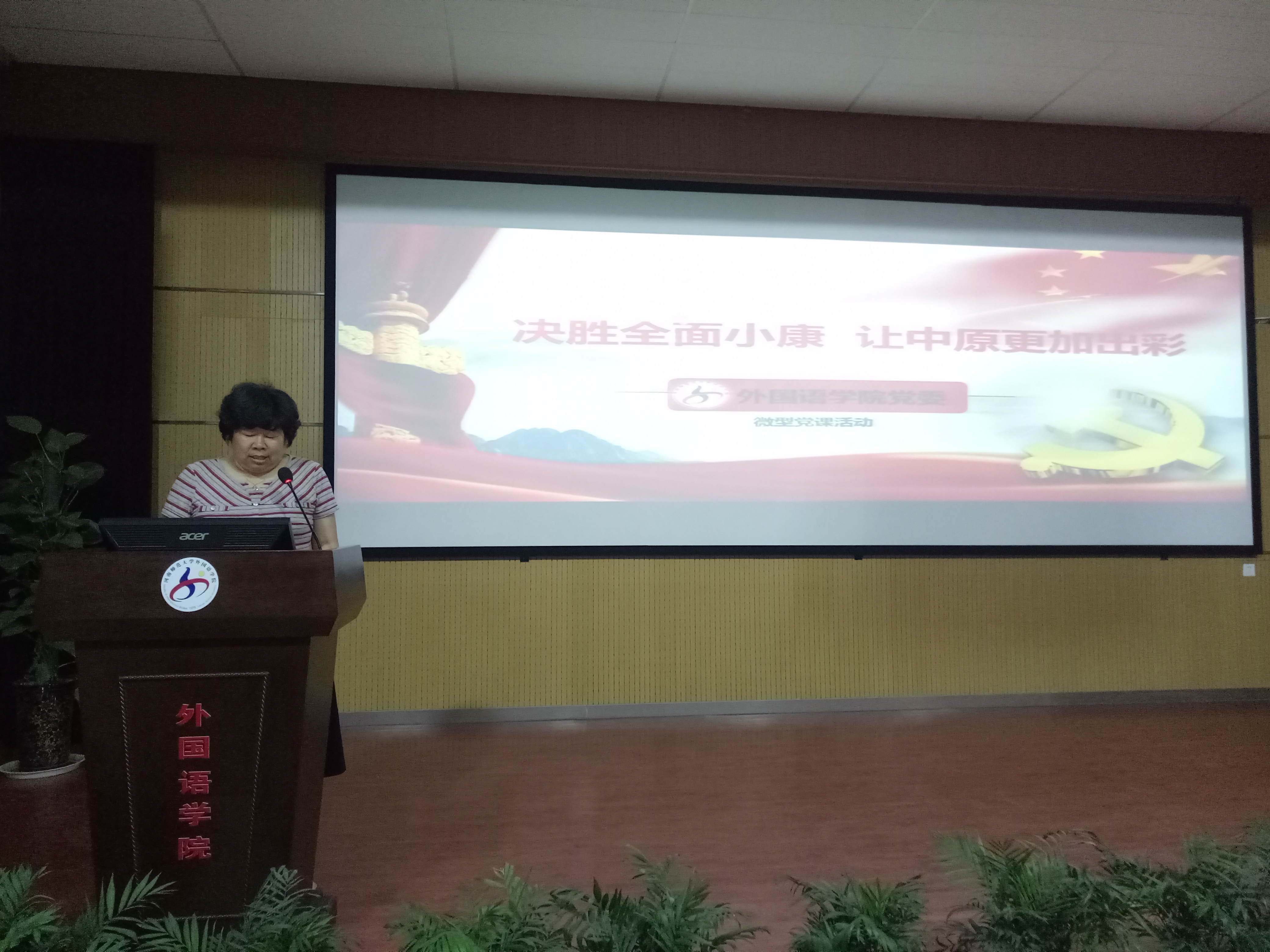 5月26日下午,外国语学院党委在外院学术报告厅开展“决胜全面小康 让中原更加出彩”优秀微型党课展示活动。在此次活动前,学院13个党支部分别开展了“党员人人上讲台”微型党课比赛活动,并推选出1名代表参加学院优秀微型党课展示活动。外国语学院党委书记宋霞、院长梁晓冬、副院长贾建嵩、党委办公室主任刘静观出席了本次优秀微型党课展示活动,学院教工党员、学生党员参加了此次活动,2015级辅导员张迪担任主持人。