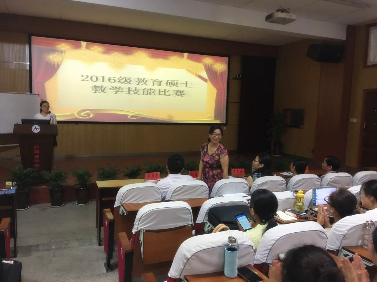 6月12日下午,我院在外国语学院报告厅成功举办了2016级教育硕士教学技能大赛。外国语学院刘国兵教授、李素枝教授、孙海燕副教授、娄宝翠教授、史晓伟副教授担任了本次比赛的评委。