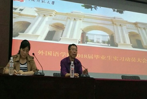 会议伊始,外国语学院教学秘书史晓伟宣读教育实习安排,按照时间段将实习流程详细解说并为学生提供信息搜索来源,从实习、支教以及实习具体日程安排三个方面进行阐述。他强调,所有师范生必须进行校内实习,且在大体实习流程框架下,不同专业要根据其具体专业安排实习具体流程;他指出,本年度的实习安排与去年有所出入,需师生互相协调,做出应对。而后,外国语学院副院长张志强从实习中相关重要性、本科毕业论文写作以及师范生技能大赛三大方面进行一一说明。首先,在实习各大重要性方面,他强调了实习的重要性,指出根据教育部规定,从2015级起,所有师范生必须进行校内和校外实习;学生在进行实习过程中要同时进行毕业论文写作,学校学院将成立评估小组对实习材料进行评估;他提出实习过程纪律的重要性,学生要遵守实习单位的各项要求与规定,完成各项实习任务;他表示实习过程中安全的重要性同样不可忽视。接着,副院长张志强根据不同专业对毕业论文写作进行了更具体详细的说明。最后,他向学生普及师范生技能大赛的相关报名要求及事宜。此外,外国语学院党委副书记曹崇又进一步对考研、就业、实习和推免进行剖析,并向学生报以希冀和厚望。在外国语学院团委书记唐新总结近来工作后,外院2014级年级大会也借此机会召开,2014级辅导员付长华就综合测评、保送研究生、研究生考试、实习、入党、毕业论文写作等问题进行一一分析阐述。