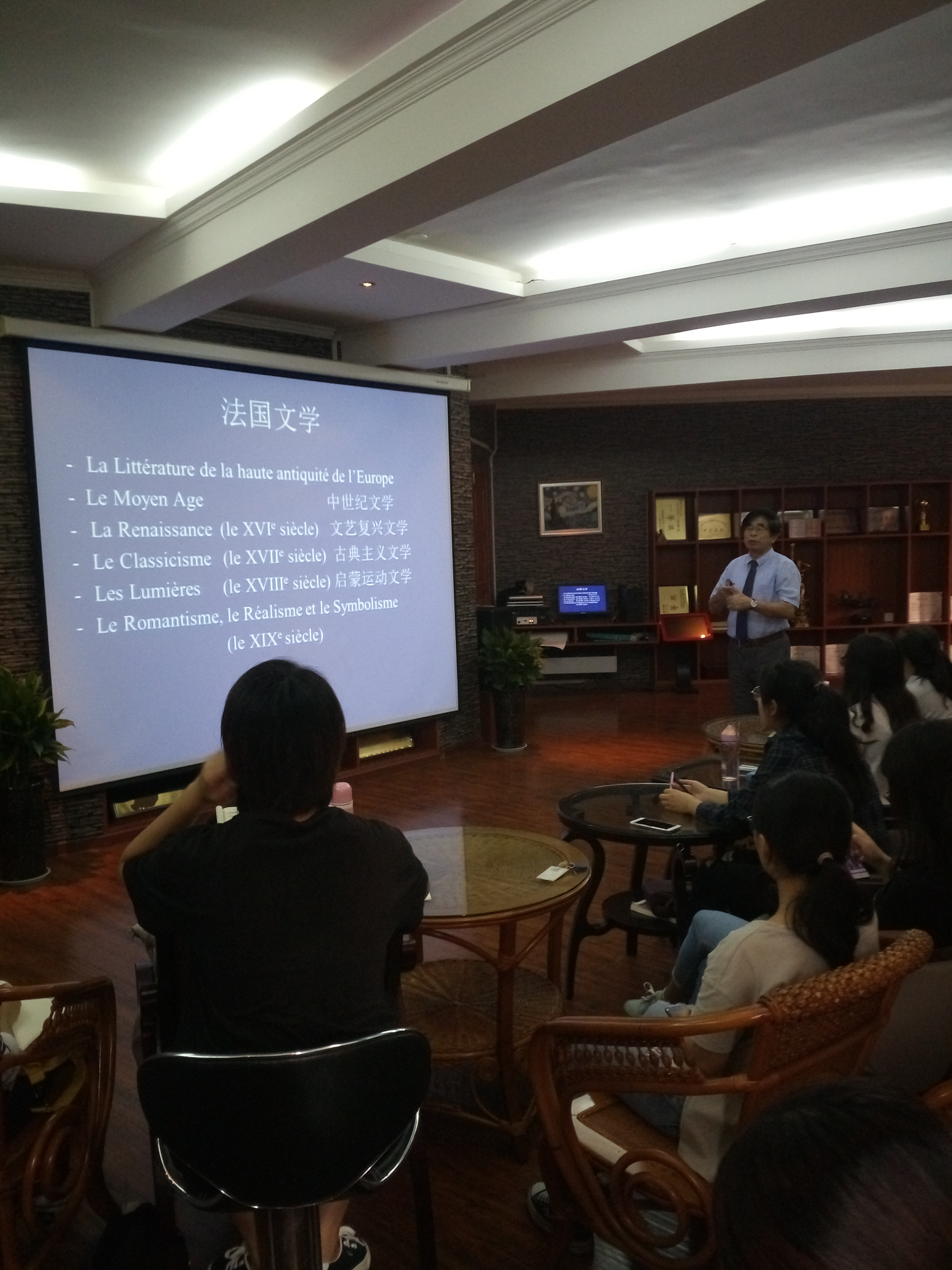 9月20日上午和9月21日上午,应外国语学院邀请,中国海洋大学李志清教授在学院Common Room作了题为“二十世纪法国文学”和“十九世纪法国文学”的讲座。讲座由外国语学院法语系主任董海老师主持,相关专业教师、本科生共三十余人聆听了此次讲座。