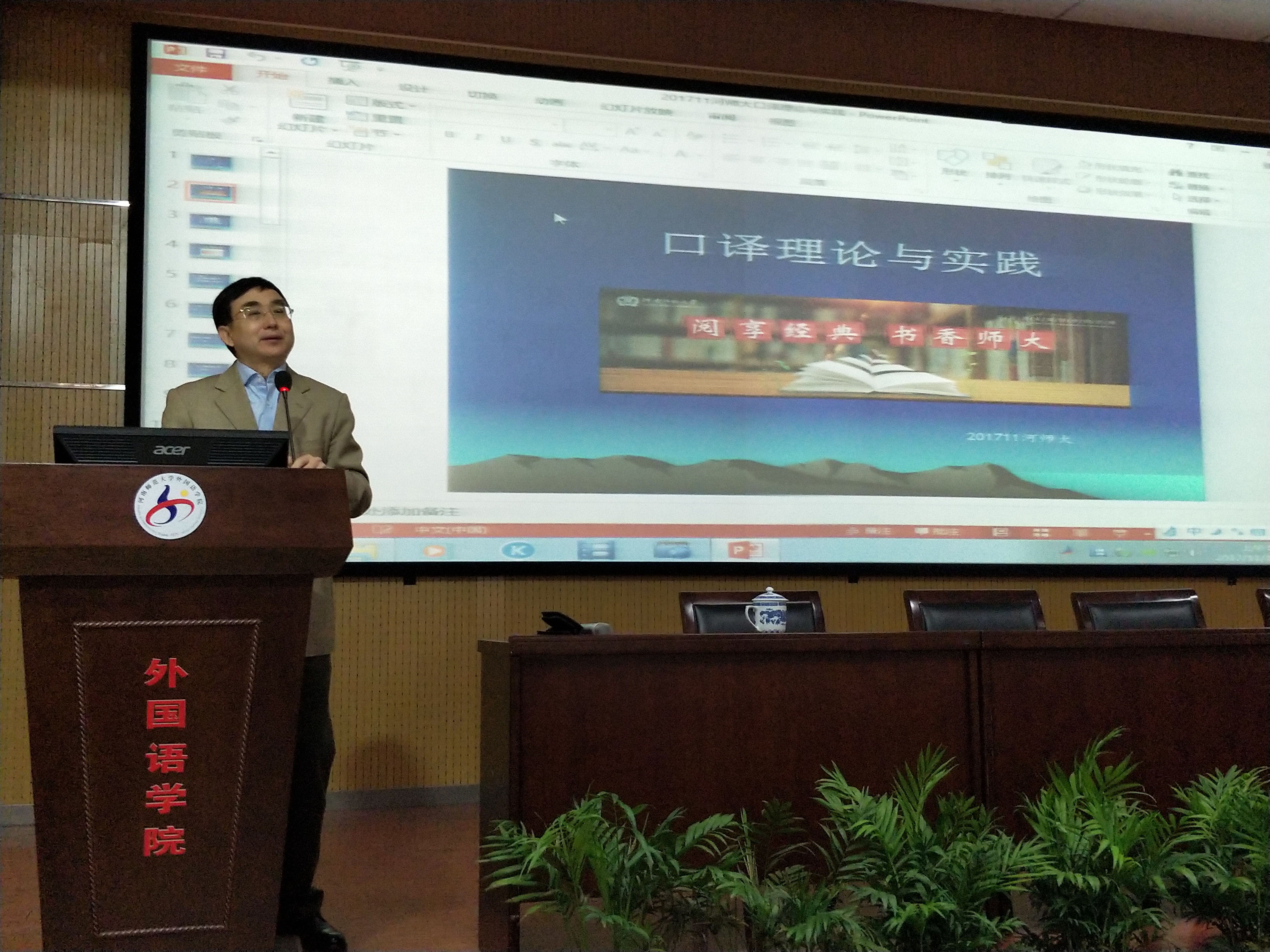 11月10日上午,应外国语学院邀请,河南省政府外事侨务办公室杨玮斌副主任在我院学术报告厅做了题为“口译理论与实践”的学术讲座。外国语学院相关专业教师、研究生共百余人聆听了讲座。讲座由外国语学院院长梁晓冬教授主持。