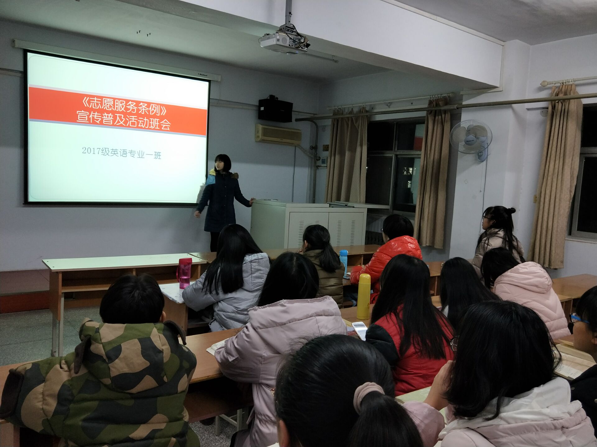 2017年12月11日,外国语学院2017级本科英语1班、2班全体同学,于五楼多媒体教室,开展《志愿服务条例》知识答题活动。活动伊始,2017级辅导员彭典范老师向同学介绍《志愿者服务条例》的有关内容,并宣布活动开始。参与答题的同学,个个信心满满,竞答环节中同学们眼疾手快,一山更比一山高,整个过程跌宕起伏,引人入胜。