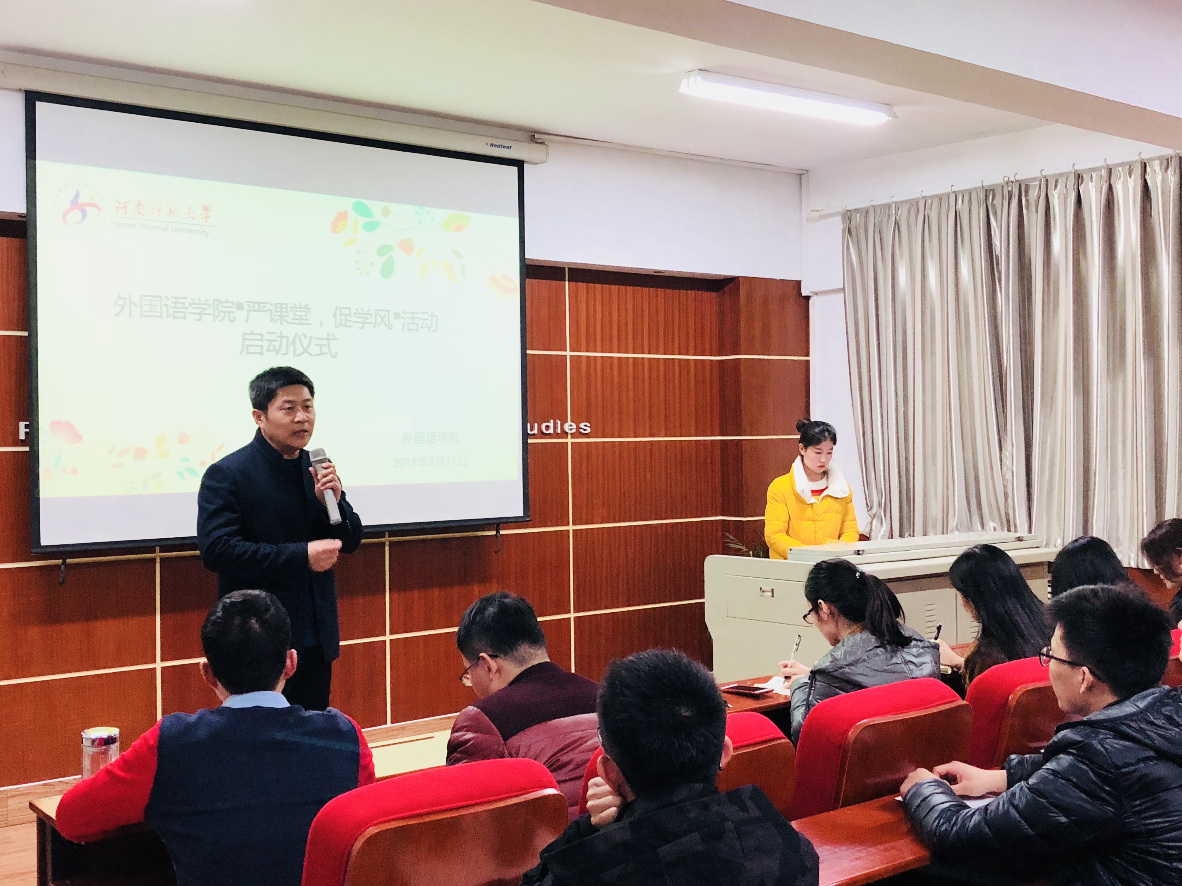 为加强我院学风建设,提高学生上课率,外国语学院学生会于3月11日晚7:30在国培教室举行“严课堂 促学风”活动启动仪式,我院党委副书记曹崇、各年级辅导员以及百余名学生干部出席本次活动。