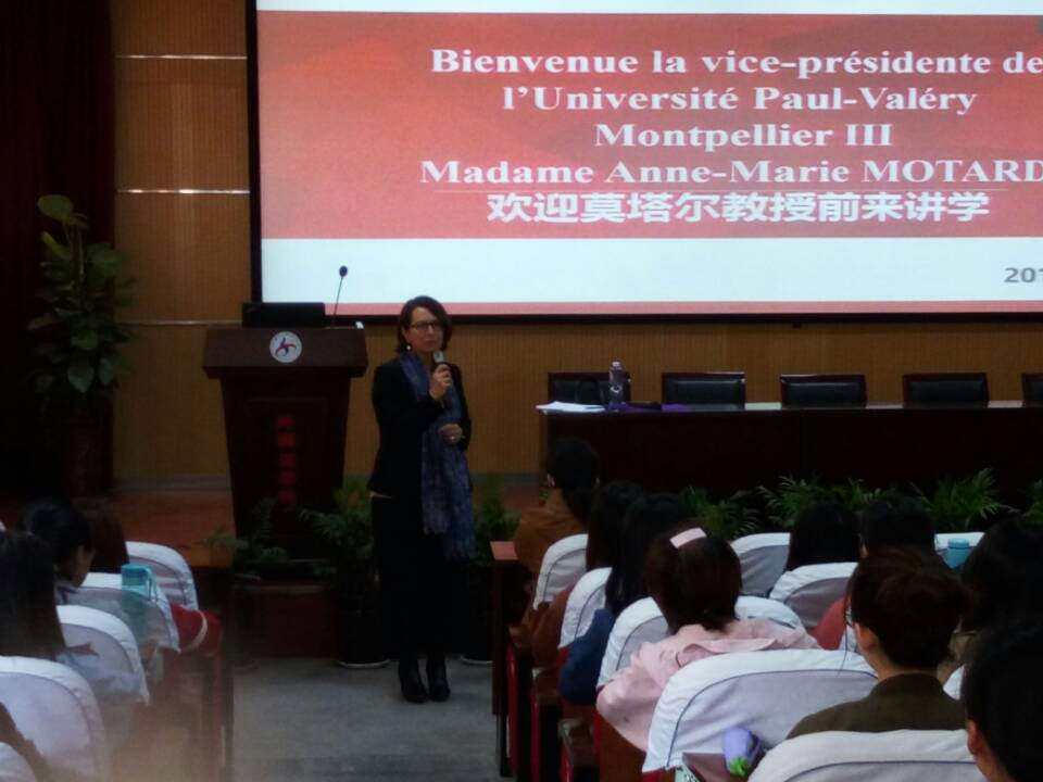 4月11日上午,应外国语学院邀请,蒙彼利埃三大副校长Anne-Marie MOTARD教授在我院学术报告厅进行了题为Les paradoxes de la question nationale en France的讲座。讲座由外国语学院法语系主任董海主持,相关专业教师、研究生、本科生共百余人聆听了此次讲座。