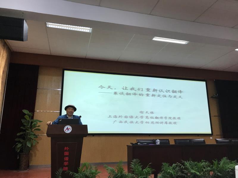 4月18日,应外国语学院邀请,上海外国语大学谢天振教授在我院学术报告厅做了题为“今天,让我们重新认识翻译——兼谈翻译的重新定位与定义”的学术讲座。外国语学院相关专业教师、研究生共百余人聆听了讲座。讲座由外国语学院张志强教授主持。