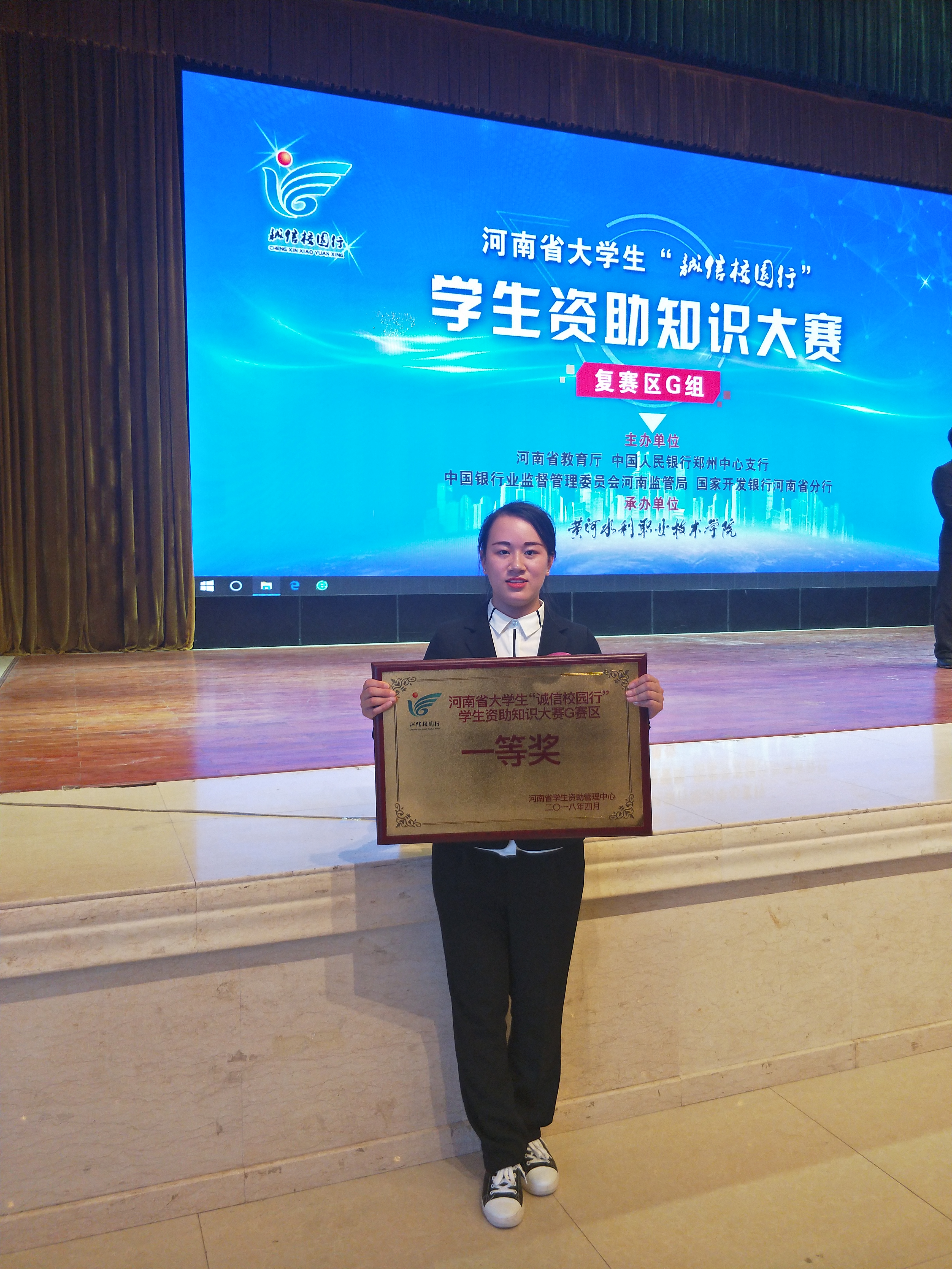 4月18日-20日,由河南省教育厅、中国人民银行郑州中心支行、中国银监会河南省监管局、国家开发银行河南省分行主办的大学生“诚信校园行”学生资助知识大赛G赛区复赛在黄河水利职业技术学院举行。本赛区共有19个高校参加,我校代表队在比赛中荣获第一名。