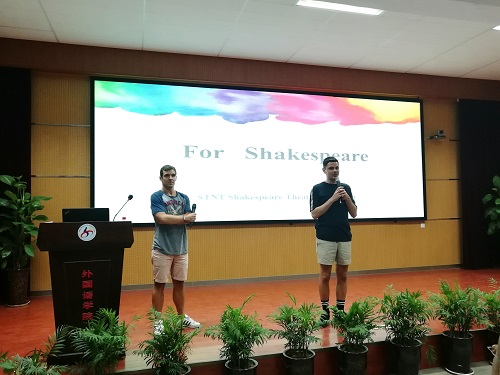 培训会上,两位导演通过戏剧表演技术讲述了学习戏剧与英语的方法与途径。戏剧表演中表情训练与形体训练是本次教学的重点之一。在两位导演的带领鼓励下,同学们从戏剧中常见的夸张脸部表情、手足动作练习中体会到表演的乐趣与精髓。此外,Christan与Adam也分享了许多训练语音语调、提高声音饱满度的小技巧。许多学生表示这次的亲身经历使他们对戏剧表演有了初步认识,对表演及发音技巧有了更进一步的了解。最后,莎剧演员表演了《仲夏夜之梦》,得到了专家高度赞扬与认可,现场气氛再次达到高潮。