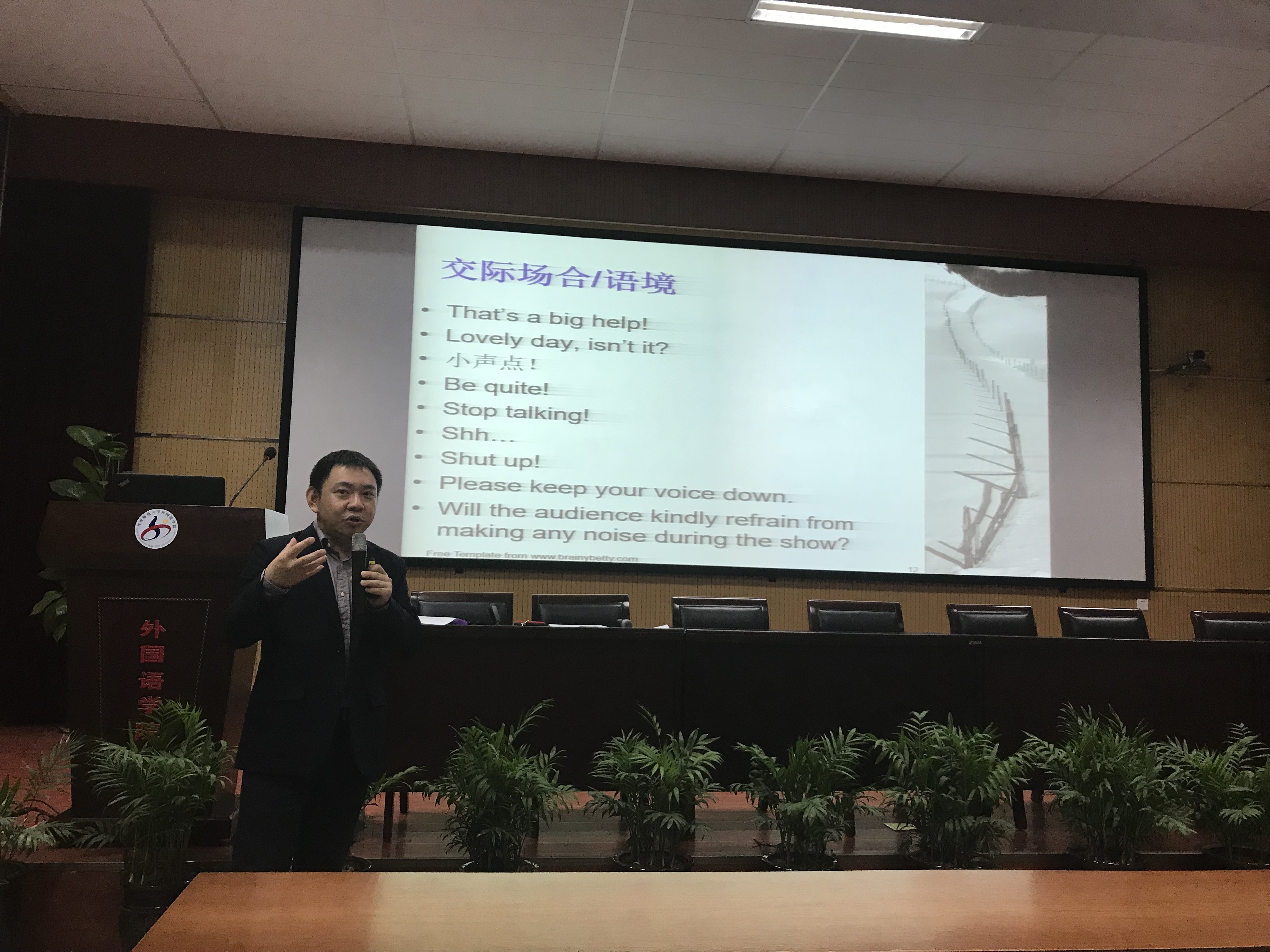 詹成从口译定义入手,指出口译是沟通媒介,口译即沟通。之后他详细讲解了口译和笔译在声音和文字上的区别以及口译的类型,同时强调了在翻译的职业化时代,口译的时间性,交际的一次性等特点,并就此指出口译员应具备的素质。讲座最后,詹成结合具体实例对口译训练内容、途径和方法提出了基本构想。