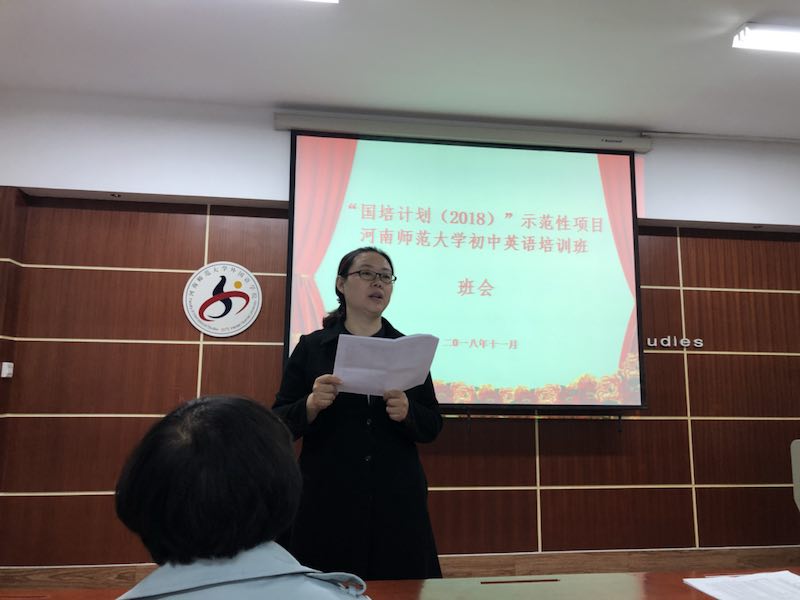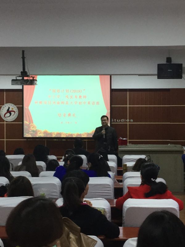 11月14日上午8点,由外国语学院承担的教育部示范性项目“国培计划(2018)”——中小学一线优秀教师研修项目初中英语班结业典礼在外国语学院国培教室举行。外国语学院国培项目主管、副院长贾建嵩出席仪式并讲话。外国语学院国培项目学科专家王晔、班主任宋丽霞、白宇镜及来自全国各地的50名一线优秀教师等参加了典礼。来自南京二十九中学的学员代表高承霞发言,对本次培训发表心得并对教育部国培计划项目及组织实施本次项目的外国语学院表示感谢。