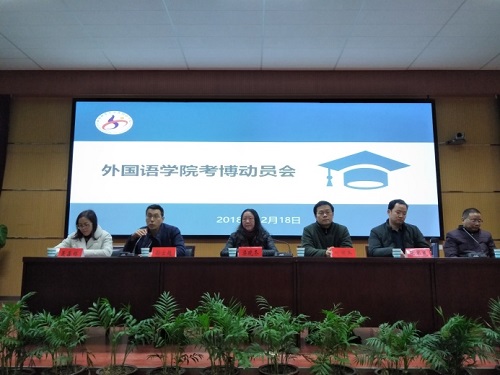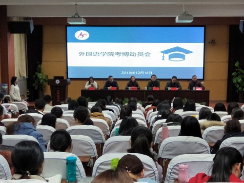 为帮助我院硕士研究生进一步认识考博的重要性,营造良好的科研氛围,12月18日晚,外国语学院在院学术报告厅召开2018年考博动员会暨经验交流会。院长梁晓冬博士、副院长刘国兵博士、孙士超博士、张军民博士、张锐锋博士、聂鑫林博士出席本次动员会。会议由研究生辅导员唐新老师主持,百余名硕士研究生参加了此次会议。