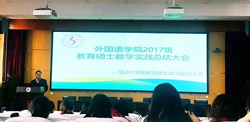3月15日下午,我院在外国语学院报告厅召开了2017级教育硕士教学实践总结大会暨2018级教育硕士实习动员大会。学科教学(英语)教育硕士校内教育实践指导教师刘国兵、王晔、王彩琴、李素枝、娄宝翠、孙海燕、史晓伟、张军民和2017 、2018级教育硕士全体研究生参加了此次会议。