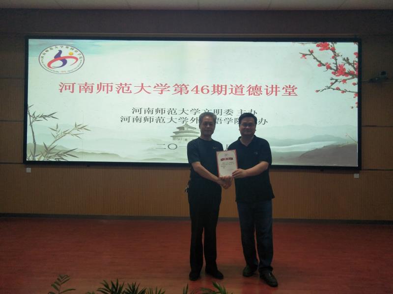 为扎实推进学校师生思想道德建设、全面贯彻落实党的教育方针、引导全体师生自觉成为先进道德的传播者和践行者,5月24日晚,由我校文明委主办,外国语学院承办的第46期道德讲堂宣讲活动在外国语学院报告厅举行。外国语学院副院长贾建嵩、外国语学院团委书记唐新出席本次活动,外国语学院师生代表200余人参加本次活动。