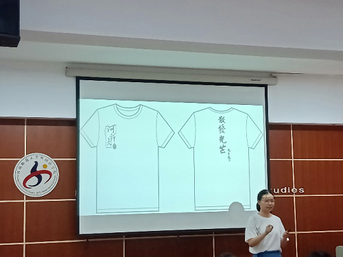 本次比赛以“五四有你不一‘young’”为主题,共有10个班级参赛。各班负责人分别通过PPT对本班作品进行了精彩解说与细致展示。其设计作品从班服到手帕,都代表了本班独特的文化与风采。其中,18级英语五班班服以“ENGLISH”来突出专业特点,两边的蓝色象征翅膀,中间用“5”字构成向前奔跑小人的形状来突出班级特色。整个logo象征着英语五班搏击长空,勇往直前的精神风貌,让人眼前一亮。三位评委进行现场提问,通过问答引导参赛选手更好的阐述相关构思与创意。最后,评委从设计理念、实施方案、改进措施等方面做出精彩点评并提出建议。最终九个班级脱颖而出成功晋级决赛。