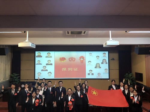 红色的团徽团旗和“师小团”相互映照,十八位团代表聚集在报到证周围,让人眼前一亮。团代表们面带微笑和“师小团”合影,做好了充分准备,举手示意向团代会报到。现场造型取汉字“十八”字样,表达了18位团代表向我校第十八届团代会报到的祝福和期待。18位团代表在红色的团旗面前立下誓言,表示要坚定理想信念,争做青年先锋,严守纪律,不忘初心,砥砺前行,做与新时代共同进步的追梦人。