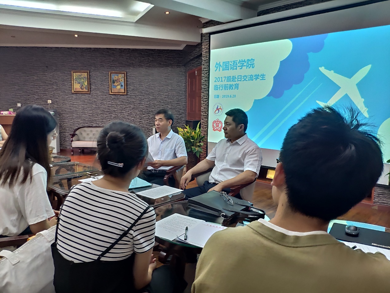 为进一步提高赴境外交流学生的安全意识,确保赴境外交流项目的有序开展,6月28日下午,外国语学院在Common Room召开2017级日语专业境外交流项目行前教育交流会。国际合作交流处副处长丰国林、外国语学院党委副书记曹崇、2017级辅导员彭典范及赴日本交流7名同学参加本次会议。