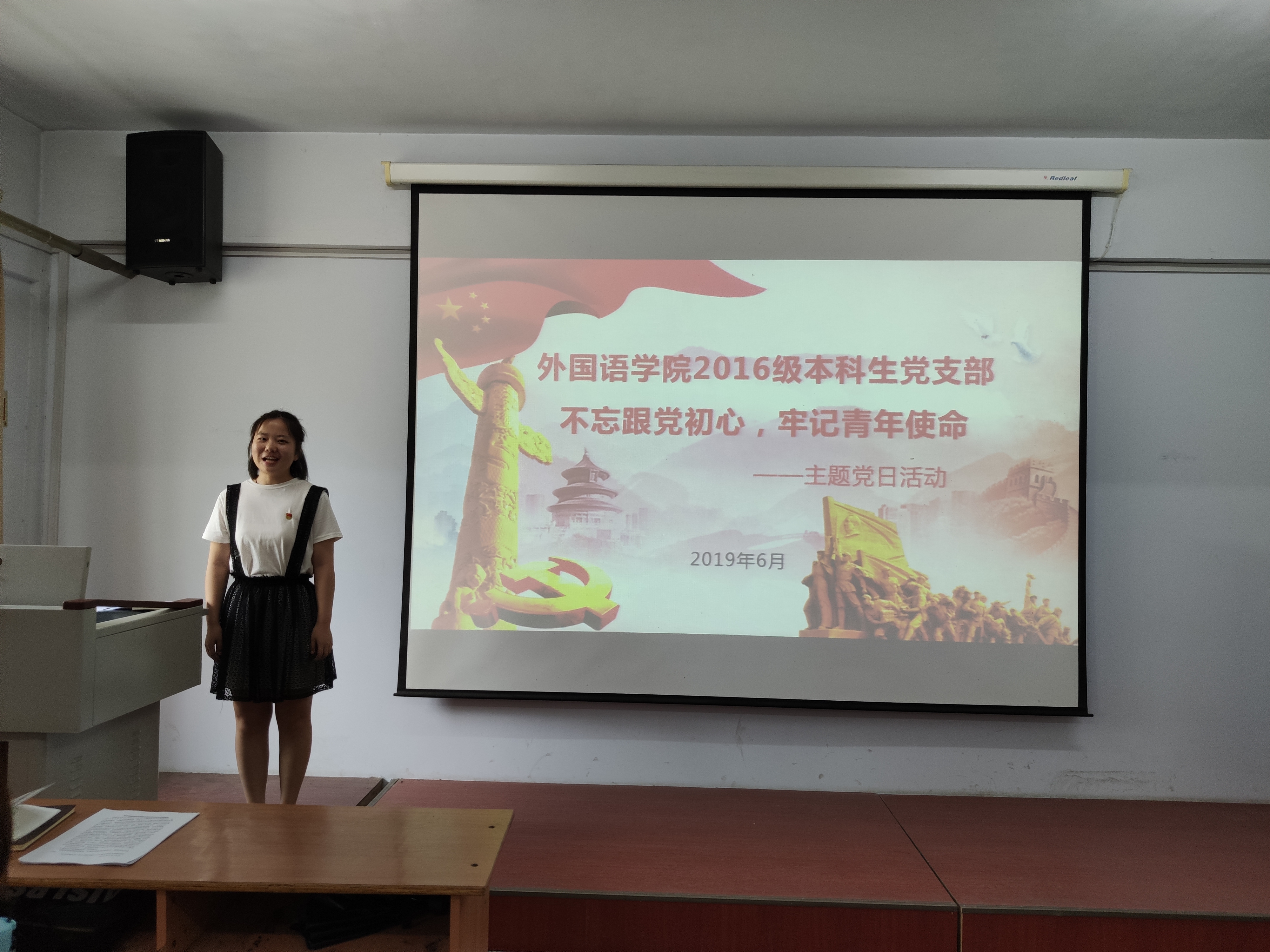 初心不改,使命不忘。6月29日,外国语学院2016级本科生党支部在外语楼多媒体教室开展“不忘跟党初心,牢记青年使命”主题党日活动,2016级本科生党支部全体党员参与此次活动。