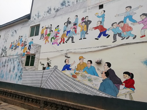 往村史馆的墙上看去,有一张集体合影。“是全村人在一起拍的全村福,真的好有特色,这张照片让我感受到了浓郁的乡土情怀。”实践队员边参观边感叹。“绽放的窑洞吐露芬芳,谁见过土窑洞如此出众。”以河南农村戏曲为主旋律的歌曲响起,吸引了实践队员的注意,大家循着歌声跑出去,看见有人在跳广场舞。上前一问,了解到这首配乐是他们的村歌《绽放的窑洞》,“还有村歌呢,真的是很新奇”实践队员笑着说道。“我们的村歌还在上全民K歌发布了,每次我们聚会,都会点我们的村歌来唱”,跳广场舞的大妈的脸上洋溢着满满的骄傲和自豪感。继续往前走,一面大文化墙映入眼帘,文化墙为我们呈现出一幅敦亲睦邻、融洽温馨、大和同乐的景象。“老吾老以及人之老,幼吾幼以及人之幼”看着文化墙,实践队员脱口而出这句话。处在这样一个村子里,让大家实实在在地沐浴到了时代文明新风。