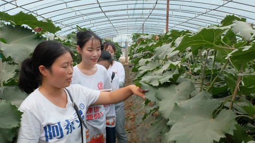 夏风拂动,初见其人。7月11日下午,伟德官网下载苹果版实践队员来到了这个名不见经传的小村庄——中牟县大段庄,在这个村庄里更有着一对不为人知的大学生返乡创业的夫妇——王坤坡、申小雨。而就在这个日子里,实践队员随着他们,一起参观他们的现代化葡萄种植基地。