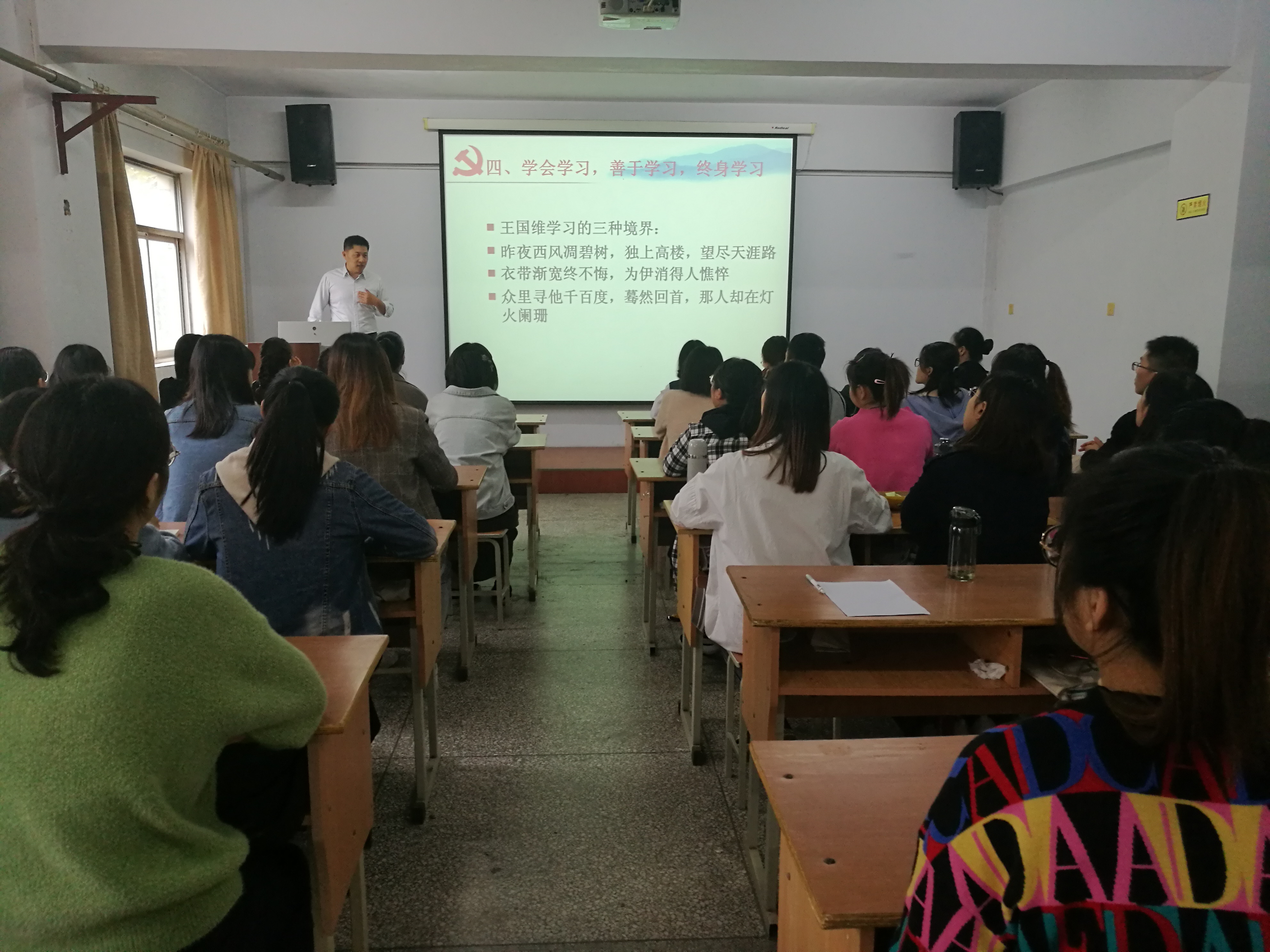 为深入推进“不忘初心、牢记使命”主题教育活动,引导广大学生党员坚守初心,提高党性修养,10月11日上午,外国语学院党委副书记曹崇在学院多媒体教室1为全体学生党支部讲授党课,学院全体学生党员参加此次活动。