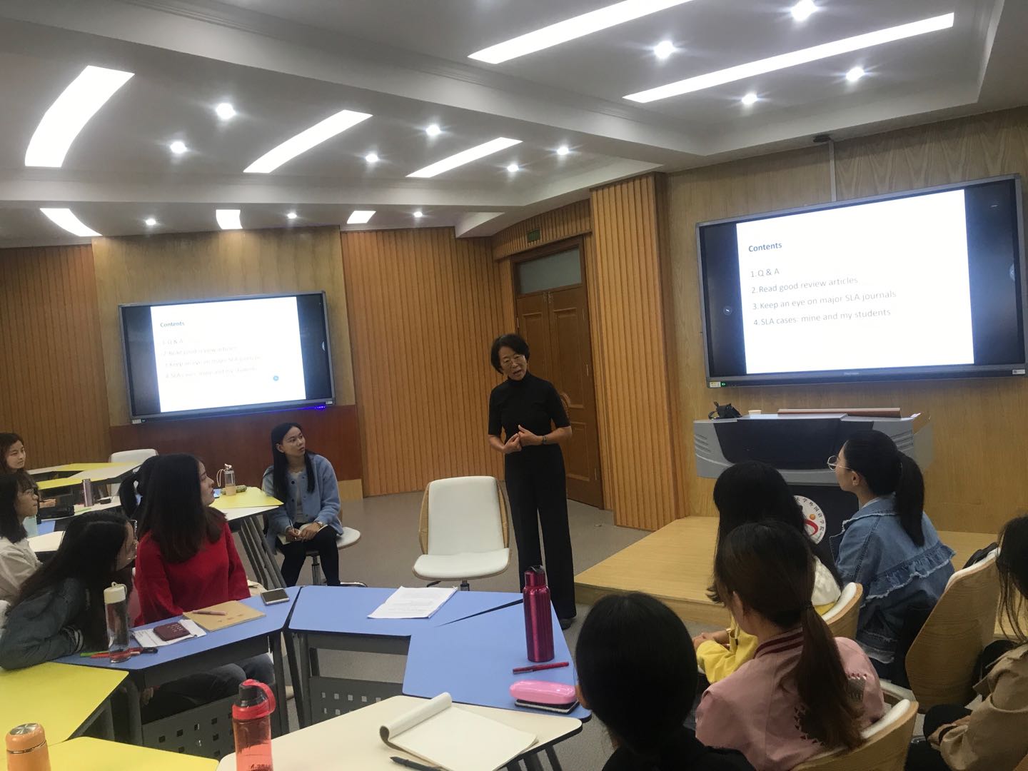 11月1日下午,在外国语学院Common Room,黄月圆作了题为“二语习得与英语教学”的讲座。在讲座中,黄月圆首先全面综述分析语言习的主要理论,梳理并总结语言习得研究领域的成果,探讨了语言习得理论在英语课堂教学中的应用以及当前研究热点。黄月圆还强调语言学习与教学应当遵循语言习得规律,同时语言习得研究成果为语言教学提供理论支撑。
