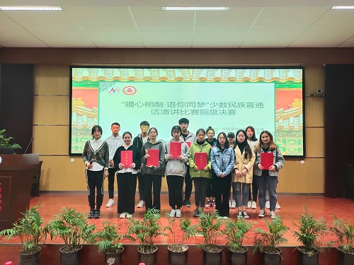 比赛采取主题演讲的形式,参赛选手们围绕“增强民族团结,筑就家国梦想”为主题展开演讲,他们风格各异,或慷慨激昂,或声情并茂,或感人至深。其中,来自新疆的巴哈尔姑丽讲述了自己家乡的风土人情以及民族团结工作的开展情况,“你中有我,我中有你,民族团结一家亲”的文化氛围在坚定朴实的话语中流露出来。阿曼尼萨将自己与汉族同学进行普通话交流学习、新疆特产“馕”等身边小事串联在一起娓娓道来,给同学们留下深刻印象,赢得观众阵阵掌声。比赛结束后,评委代表王瑞从比赛主题、形象风度、语音语调等方面对选手的表现进行全方位的点评,同时鼓励选手在舞台上要保持落落大方。经过激烈的角逐,旦增曲珍、古丽买热木和张爽爽三名同学荣获一等奖,其他同学分别获得二、三等奖。比赛在老师与获奖同学的合影留念中圆满落下帷幕。