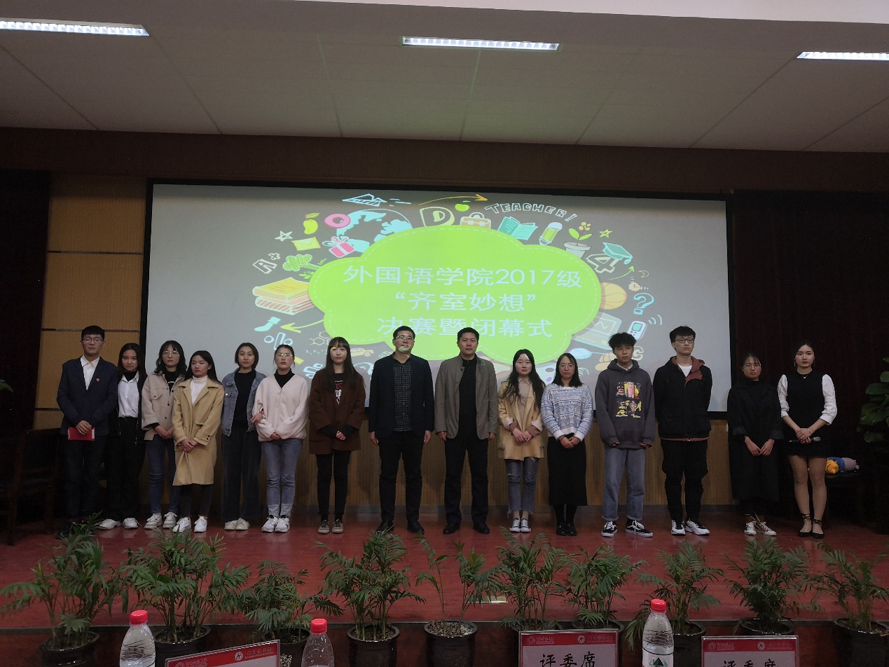 为丰富广大学生的宿舍文化生活,增进宿舍同学间交流互动,11月13日晚,由外国语学院2017级年级举办的宿舍文化节暨“齐室妙想”活动决赛暨闭幕式在外国语学院报告厅举行。本次比赛由外国语学院党委副书记曹崇、2017级辅导员彭典范、2018级兼职辅导员郭琳琳、研究生兼职辅导员张莹、2017级兼职辅导员赵羽佳担任评委,2017级近二百名学生现场观看了比赛。