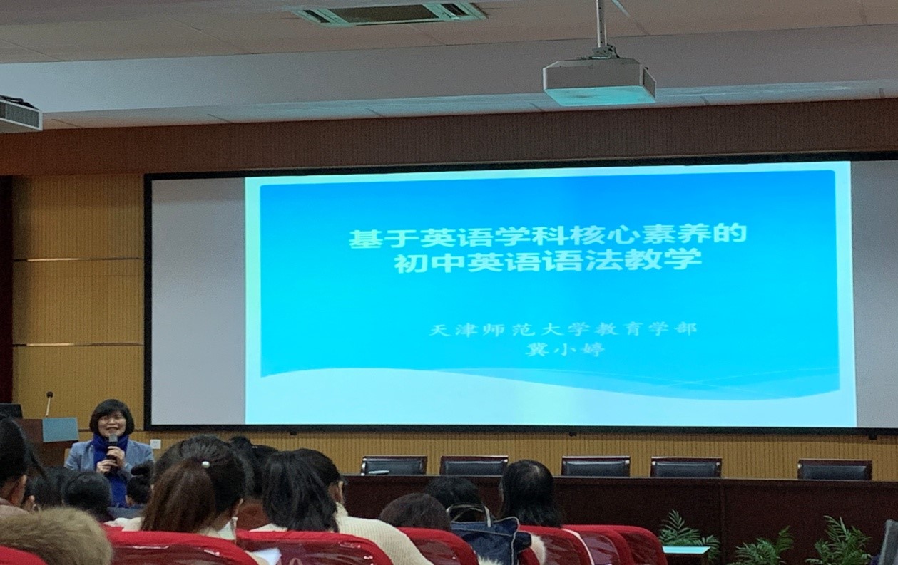 上午的讲座“基于英语学科核心素养的初中英语语法教学”,冀小婷教授首先从语法技能的概念入手,着重分析了在学习词汇、短语结构和语法结构时,应注意形义用的三结合,继而通过生动形象的例证和课堂活动,直观地呈现了核心素养下的中小学英语词汇教学和语法教学的多种策略。最后冀教授鼓励在场的一线教师及同学们不断更新个人知识体系和知识范畴、拓展个人思维能力,积极探索培育英语学科核心素养的新路径。