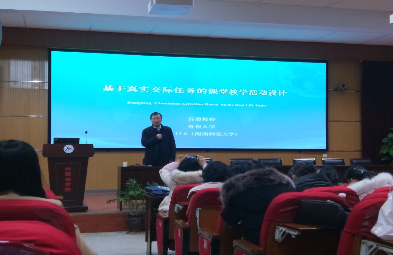 126日上午,应外国语学院邀请,鲁东大学苏勇教授在外国语学院学术报告厅作了题为“基于真实交际任务的课堂教学活动设计”的讲座。外国语学院教育硕士专职秘书、教育硕士导师王晔和全体教育硕士聆听了讲座。
