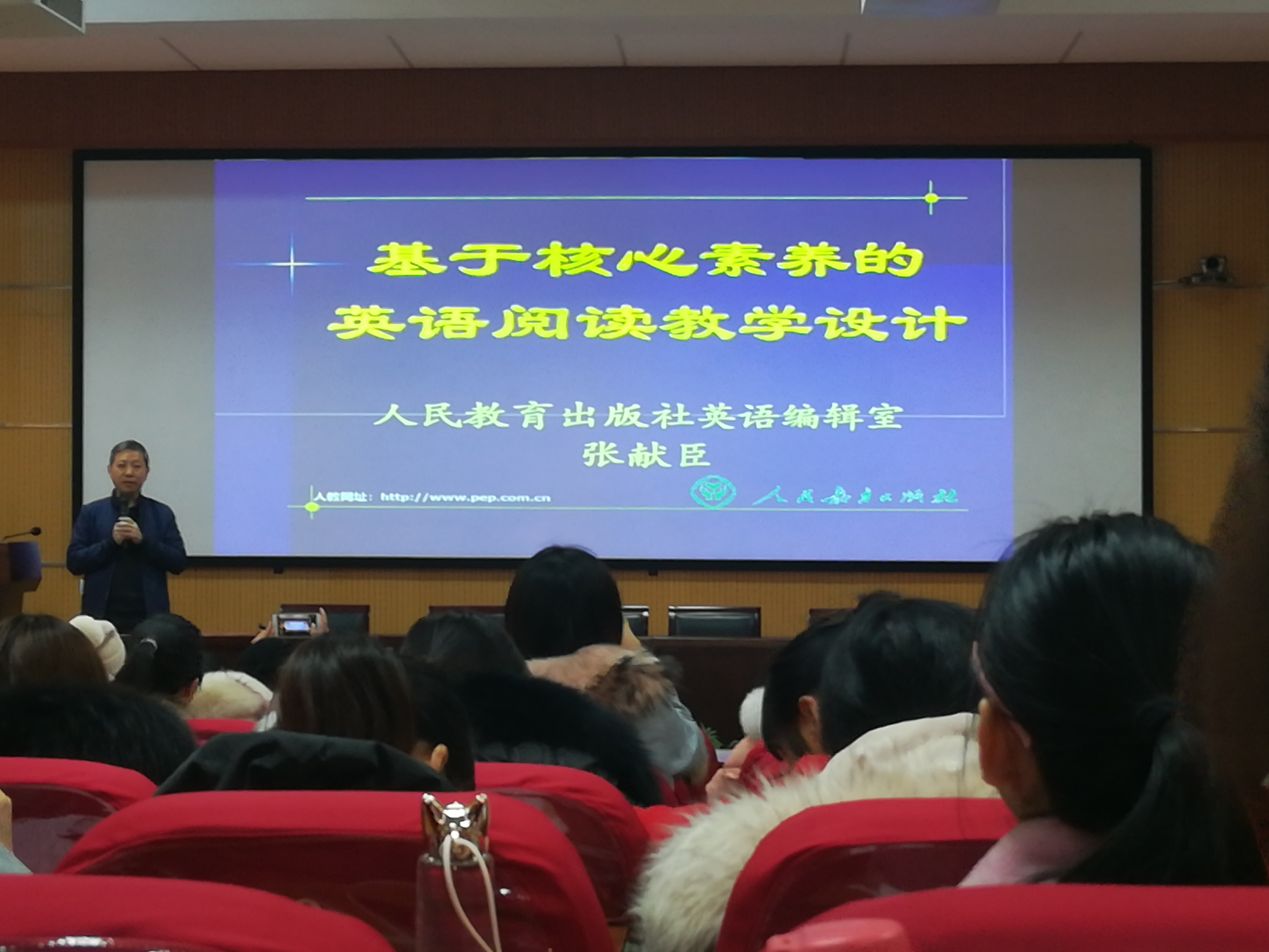 12月7日下午,人民教育出版社英语编辑室副主任张献臣老师应外国语学院邀请,在学院学术报告厅作了题为“基于核心素养的英语阅读教学设计”的讲座, 外国语学院王彩琴教授、教育硕士专职秘书王晔副教授和全体教育硕士聆听了讲座。