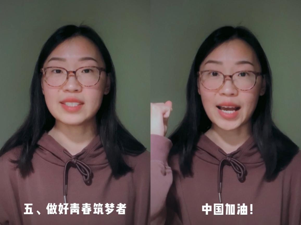 刘晓涵在视频中向学生们呼吁和学生们一起做到五个者:做好校园守护者,未经学校允许,一律不准提前返校;做好健康呵护者,加强居家锻炼,提高个人免疫力,如遇疑似症状,应秉承“早发现,早报告,早隔离,早治疗”的原则,及时上报,对自己和他人的健康负责;做好心理调节者,不信谣不传谣,充实生活,避免疫情引起的过度恐慌;做好居家奋进者,积极配合老师的教学任务,自我完善,不断进取;做好青春筑梦者,要通过此次疫情树立正确价值观,积极参与学校学院组织的线上活动,不断培养自己的爱国主义情怀。