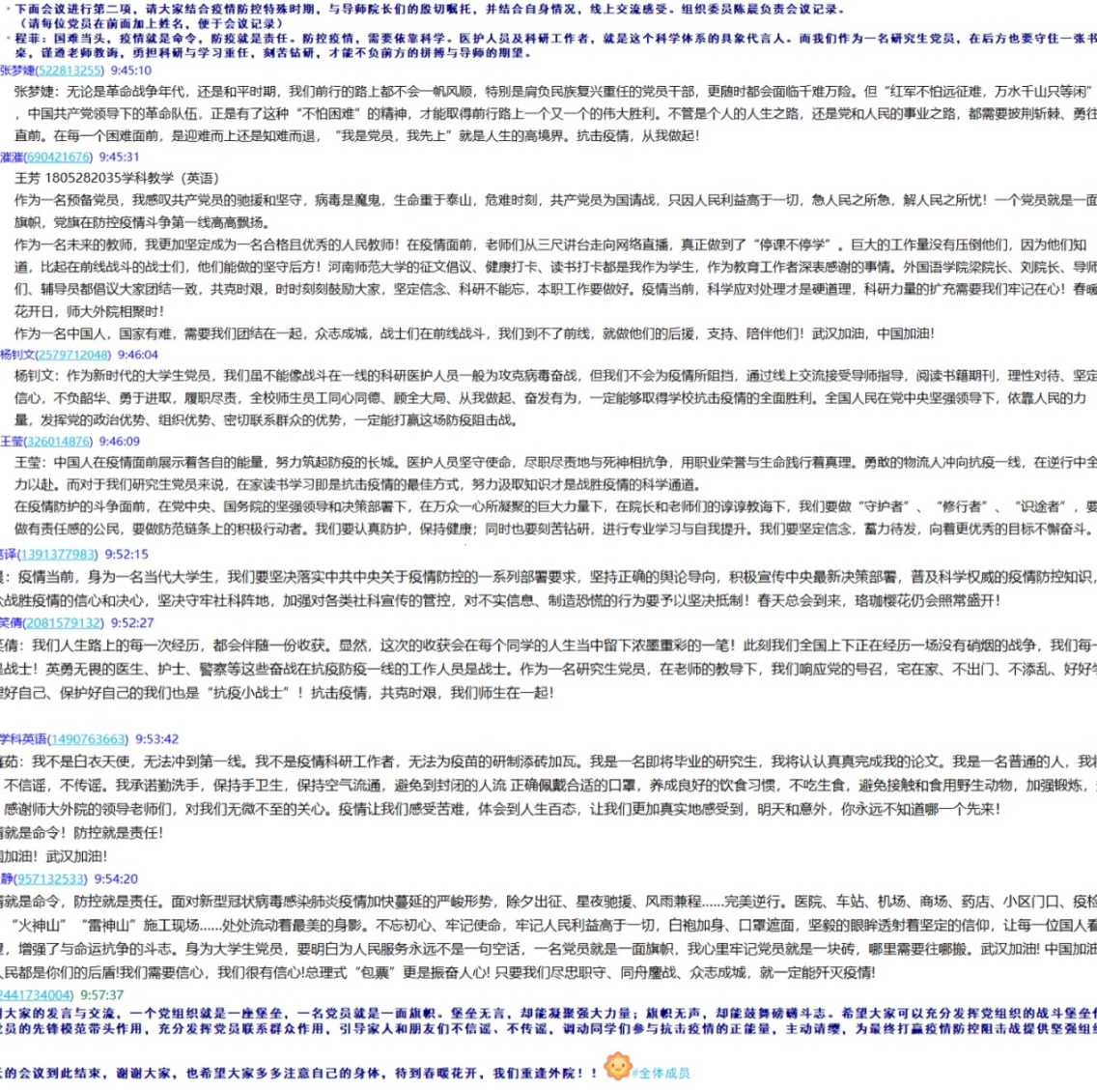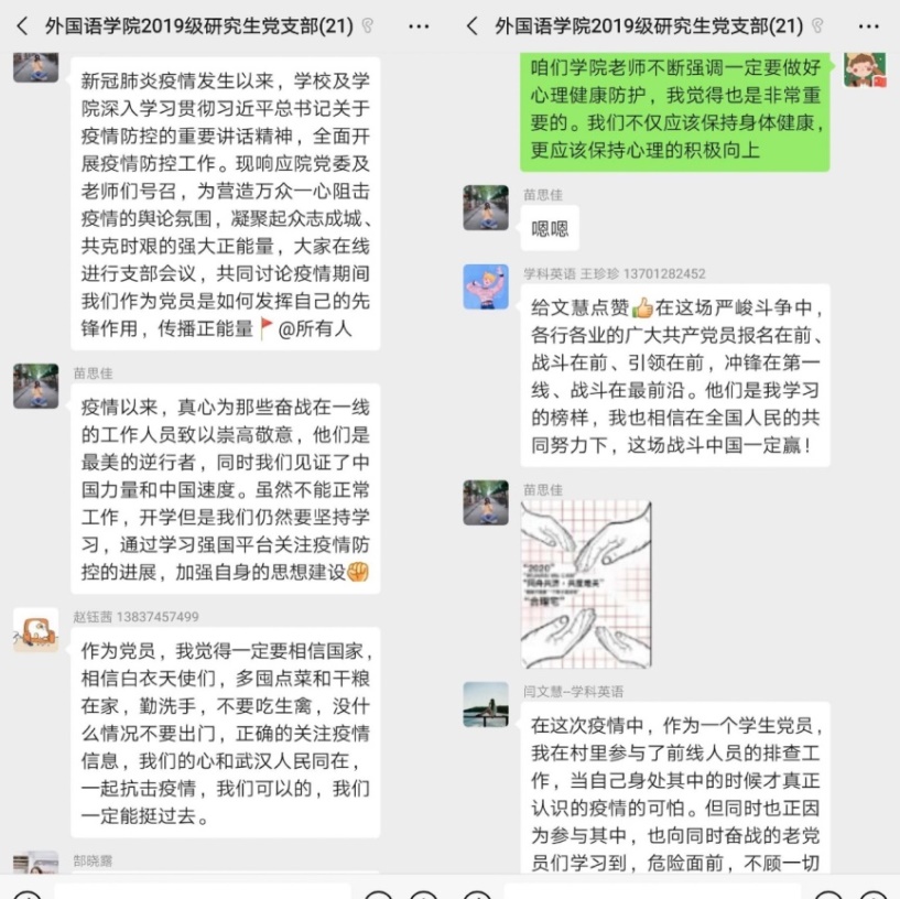 一个党组织就是一座堡垒,一名党员就是一面旗帜。堡垒无言,却能凝聚强大力量;旗帜无声,却能鼓舞磅礴斗志。在此特殊时期,伟德官网下载苹果版外国语学院2018级研究生党支部、2019级研究生党支部根据学院党委工作部署,采用线上方式开展了一次特殊的全体党员大会,会上传达了学院党员教师们“守好书桌,刻苦钻研”、“团结一心,共克时艰”的嘱托,以党建带学术建设,研究生们纷纷表示要发挥力量,学术战“疫”。