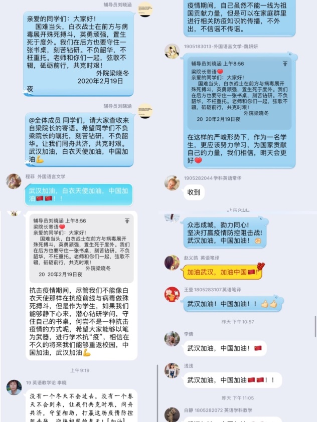 亲爱的同学们,大家好!国难当头,白衣战士在前方与病毒展开殊死搏斗,英勇顽强,置生死于度外。我们在后方也要守住一张书桌,刻苦钻研。不负韶华,不枉重托。老师和你们一起,弦歌不辍,砥砺前行,共克时艰!