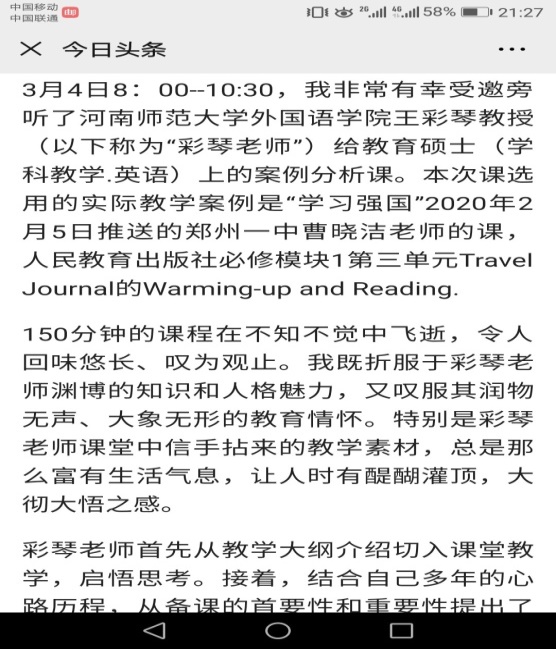 2020年2月5日的《学习强国》推送了一节高中英语课,内容是人民教育出版社高中英语必修模块(1)的第三单元Travel Journal,授课人是郑州市第一中学的曹晓洁老师(伟德官网下载苹果版2018级非全日制教育硕士)。观看了这节课后,我萌发了将这节课作为本学期第一个真实教学案例的想法,并计划邀请几位高中英语教师“进网络课堂”,参与互动。