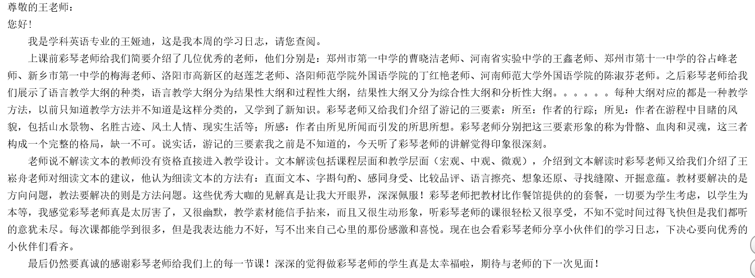 “彩琴老师带领我们阅读论文王崧舟教授的文献。我一直喜欢听语文课,因为语文和英语同属语言学习,两者相通,也一直认为如果英语老师能像教语文一样地去教英语,学生的学用能力应该会有大幅度提升。这篇文献教会我从八个方面细读文本:(1)直面文本:首先读、直接读、专注读。要一字一字盯着读,不贪多,不求快。(2)字斟句酌:不放过任何一个字、词、句、标点符号。(3)感同身受:把自己放进文本语境,让自己活在字里行间。(4)比较品评:不怕不识货,就怕货比货;穿行在多重话语之间。在多方的比较中看出它的好、它的美。(5)语言擦亮:出发点是语言,归宿还是语言,中间是语言所承载的形象、情感和思想。(6)想象还原:保持全然进入文本的敏感和警觉。(7)寻找缝隙:寻找能把握文本之魂的通道,在无疑处生疑,在生疑处解疑。(8)开掘意蕴:细细品读文本的语言。”