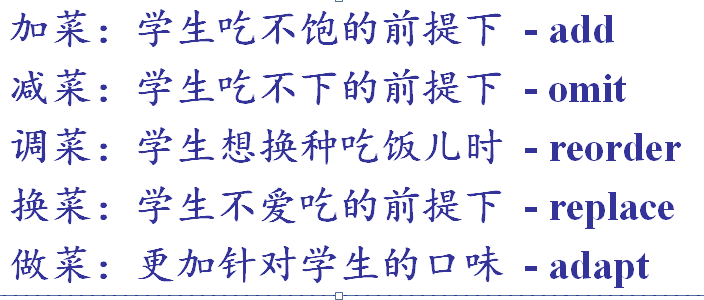 为了今后一步明确文本解读要以人为本的教育教学理念,我将“教材文本”比喻为餐馆里的既定套餐,而学生被喻为食客。于是,为了赢得更多食客的好评,餐馆就需要动态真实地调配菜肴,如: