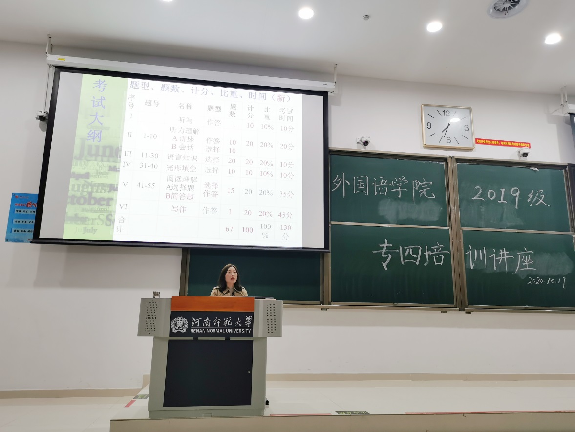 10月17日晚,外国语学院在东区综合楼302开展专业四级考试培训指导讲座,外国语学院视听教研室主任杜爱玲担任主讲人。学院相关负责人,外国语学院2019级英语专业、翻译专业全体学生参会。