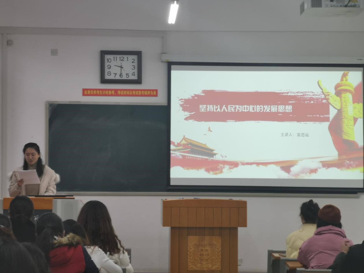 习近平总书记曾指出:“人民对美好生活的向往,就是我们奋斗的目标。”此次理论学习活动中两位分享人雷思远、刘一帆围绕《习近平新时代中国特色社会主义思想学习纲要》第三章内容“坚持以人民为中心”展开阐述。活动伊始,雷思远引用习近平总书记的“我将无我,不负人民”开篇,从根本立场、实践要求、价值追求三个方面阐述“人民”和“发展”之间的关系,即发展是为了人民、以人民的力量推动发展、发展成果由人民共享。随后,刘一帆立足于“人民”的地位、价值、意义展开演说。她讲道,以人民为中心是马克思主义政党的根本属性。是人民,参与了党的奋斗历程和实践经验总结,也正是人民,贯穿党的整个发展史,成为立党之本和根基所在。活动最后,外国语学院兼职辅导员黄敬云做出总结,她通过“绿水青山就是金山银山”的环境治理、疫情期间“停课不停学”下各类新兴助学应用的兴起等实例向学生们更为形象地传达了“什么是一切以人民为中心”,鼓励学生骨干学习党的“人民性”精神,立足于年级学生,走好群众路线。同时要坚守自己的入党初心,勤于学、敏于思、勇于践、善于悟,提升个人思想觉悟,坚定理想信念,不断向党组织靠拢。