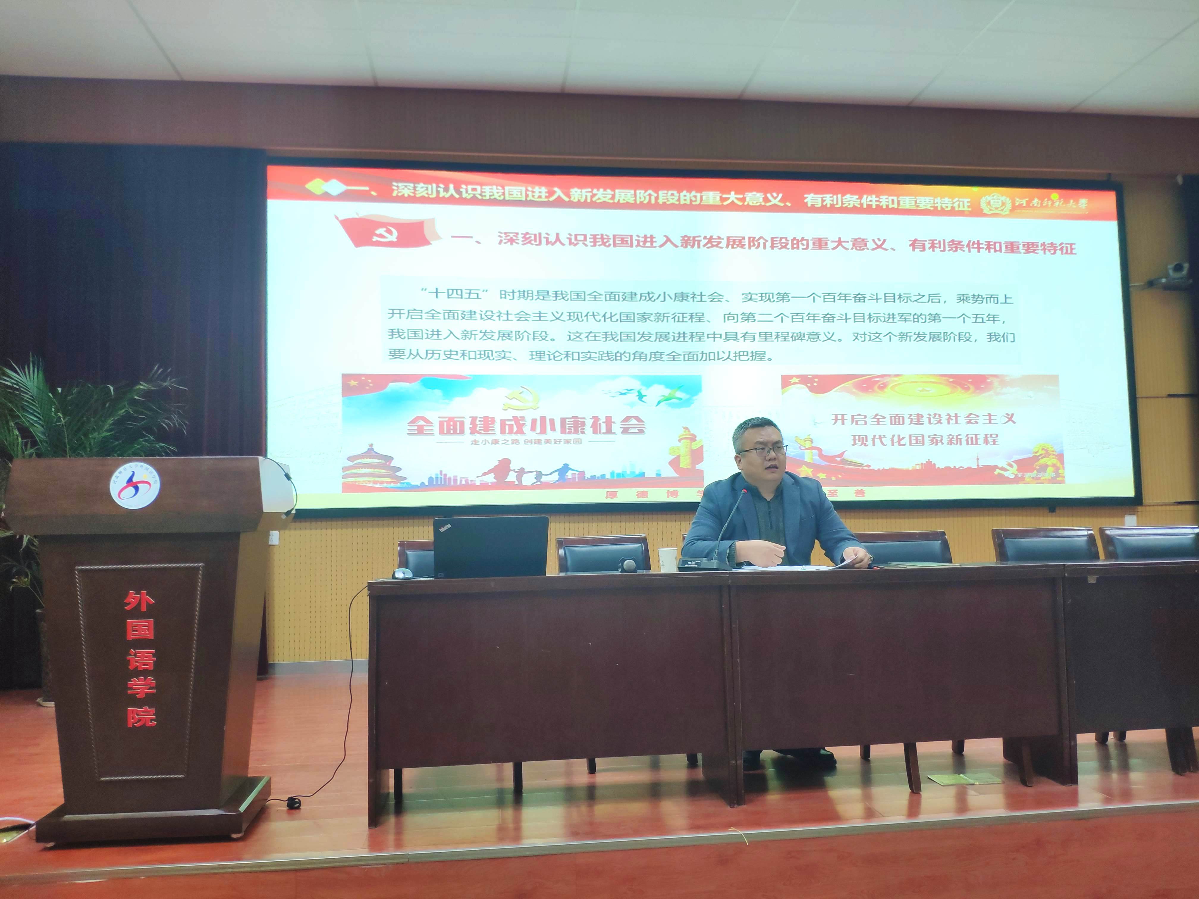 为深入学习贯彻党的十九届五中全会精神,推动全会精神在广大师生中入耳入心、见行见效,12月15日下午,外国语学院在学院报告厅举行党的十九届五中全会精神宣讲报告会,学院全体教职工、青年学生代表百余人参加会议。学院党委书记包晓光作宣讲报告。