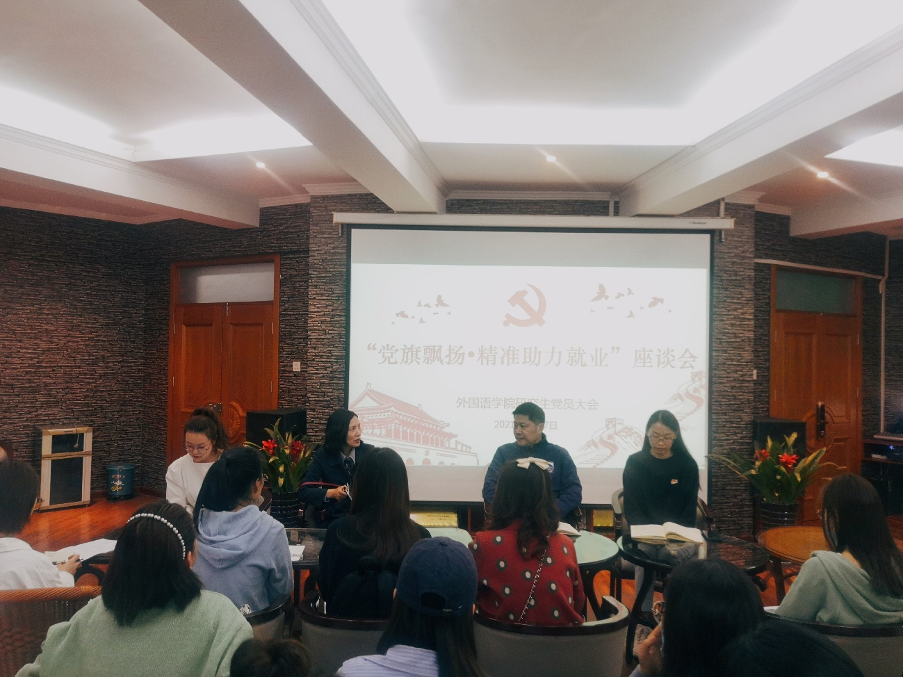 为贯彻落实党中央“六稳”“六保”决策部署,进一步推动2021届毕业生就业工作,4月27日,外国语学院在common room召开“党旗飘扬·精准助力就业”党员座谈会,学院相关负责人、2021届硕士研究生党员参加本次会议。
