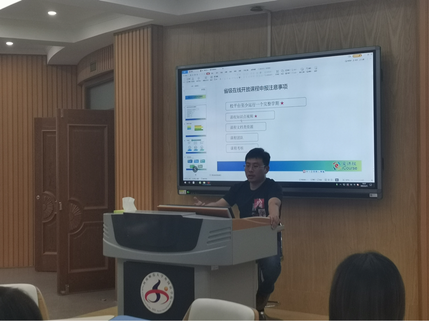 讲座中,梁存良分别从课程建设的背景,课程建设内涵和几点建议三个方面,为在场老师进行深入细致的讲解。梁存良认为追求优质教学、培养卓越人才,是人类大学一如既往的理想追求。在教育教学中,要坚持五育并举,坚持立德树人,以学生发展为中心,以产出为导向。教学目标要结合专业知识,综合实践能力,方法论,批判性思维和创新精神。教学内容要与时俱进。内容能够支持目标,教材选用符合教育部和学校教材选用规定,教学内容丰富多样,体现思想性,科学性与时代性。教学方法,教学媒体,学习方式,教学评价要具有多样性。在讲座中,梁存良提出课程材料要丰富多样,教师要树立长远的课程意识,教学中运用好微课这一教学手段等。姬坤主要从省级在线课程申报注意事项方面为在座老师进行了解读。他提出,校平台至少运行一个完整学期,课程知识点视频,课程文档类资源要完善,课程团队与课程考核要完整。