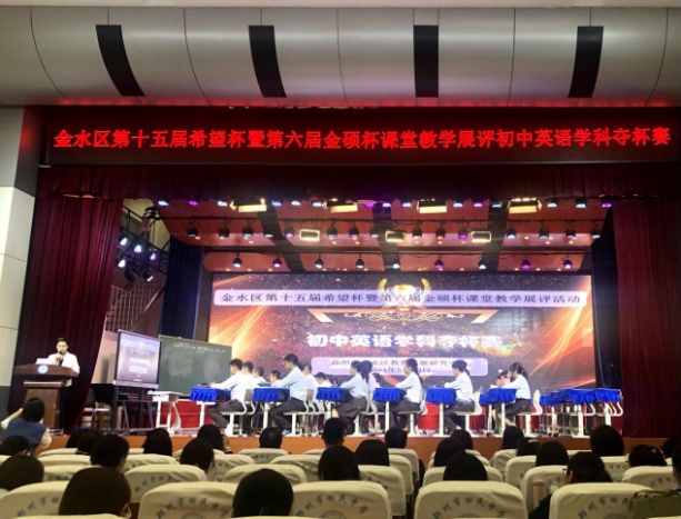 赛前,金水区教育发展研究中心中学英语教研员张卫平老师首先对希望杯及金硕杯的历史沿袭和办赛理念进行了阐述,介绍了参赛评委并对各位参与观摩的教师与学生的到来表示欢迎。本次比赛要求参赛老师依托教材,紧跟实际教学进度,进行45分钟的初中英语阅读教学展示,来自郑州市金水区多所学校的7位优秀教师从排位赛中脱颖而出,在本场夺杯赛中先后展现了自己不一样的风采,呈现出异彩纷呈的优质英语课堂。各位选手在课堂中紧扣以学生为中心的教学理念,注重师生互动,为到场评委和观众展示了金水区初中英语教学多年发展的丰硕成果。