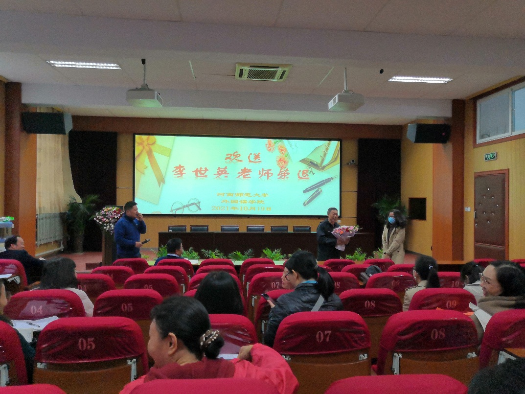曹主席代表全体教职员工感谢李世英老师30多年来对外语学院的发展付出的辛勤劳动,对李老师的荣退给予真挚的祝福,祝愿李老师荣退后生活更加幸福快乐。李老师所在的基础英语教研室也奉上了鲜花与祝福。因李老师身在外地,仪式由李老师爱人、外国语学院教师张志强教授代为参加。